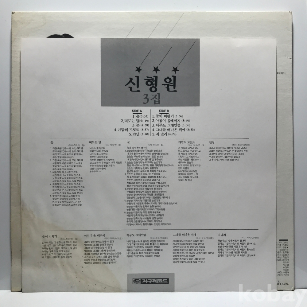 LP 17,000-61 신형원 3집 - 옷/ 종이 비행기 88 지구 자켓 EX 알판 EX