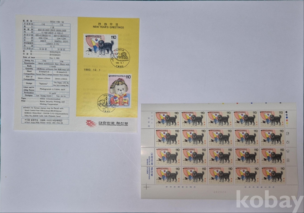 1993년 '삽살개' 연하우표 세트입니다.
