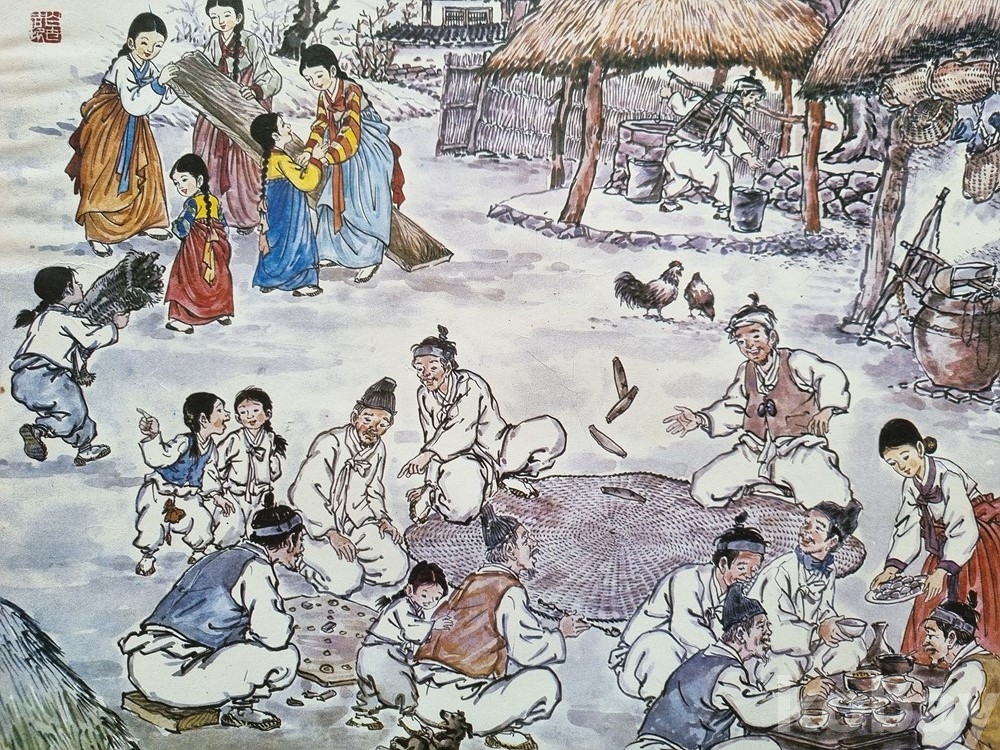 한국 전통 놀이 장면을 담은 따뜻한 수채화풍 (인쇄물)그림입니다.