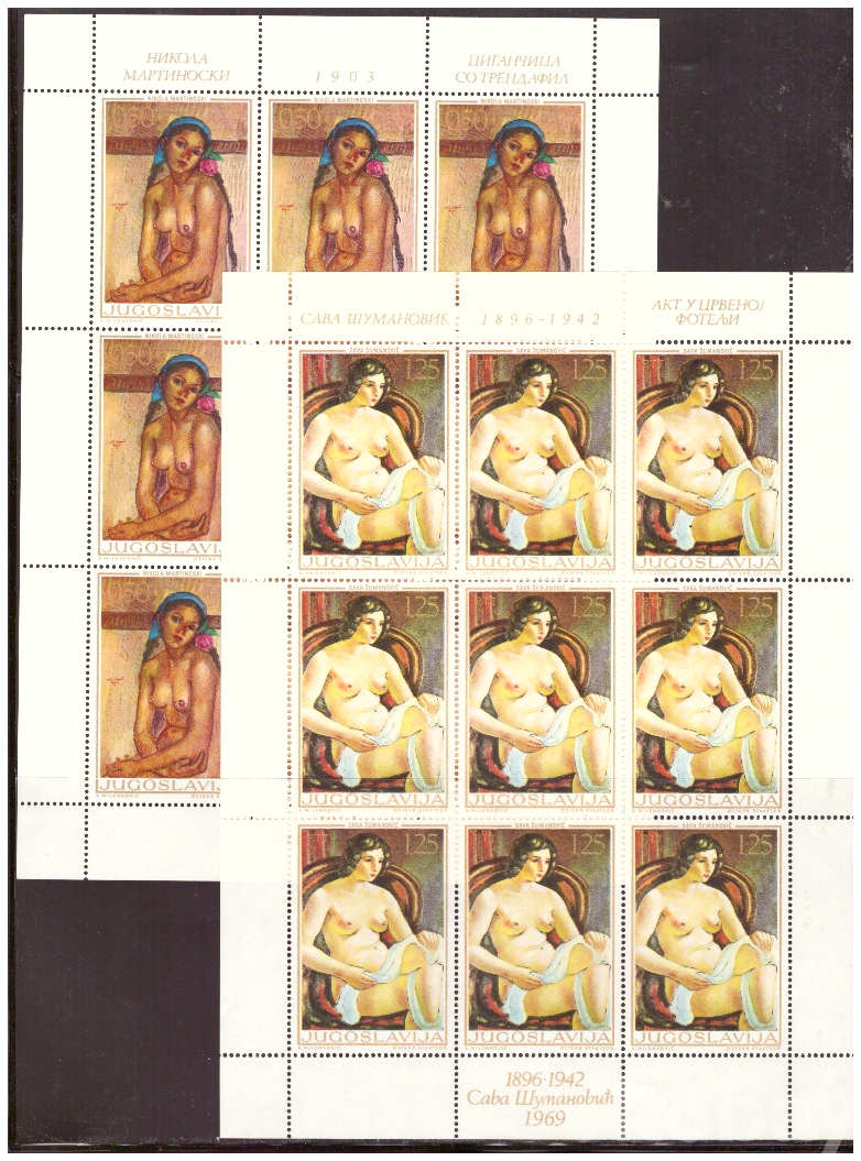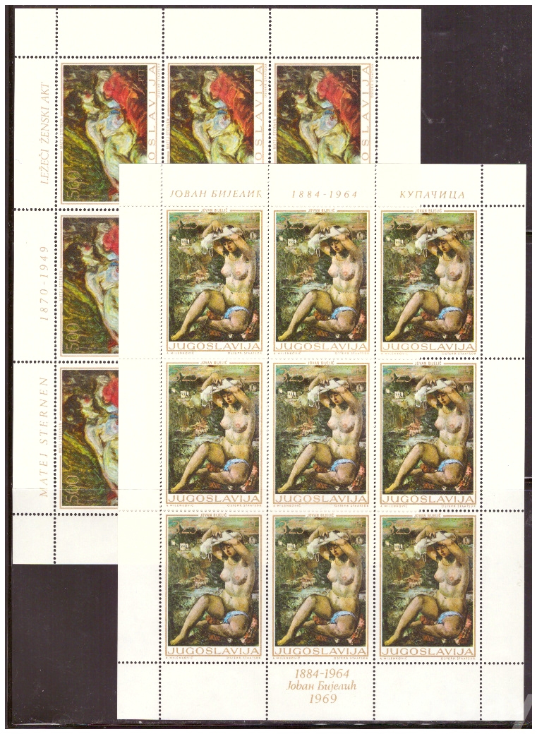 (누드명화) Yugoslavia (유고슬라비아) 1969 니콜라 마르티노스키외 누드화 6완 sheet of 9 MNH