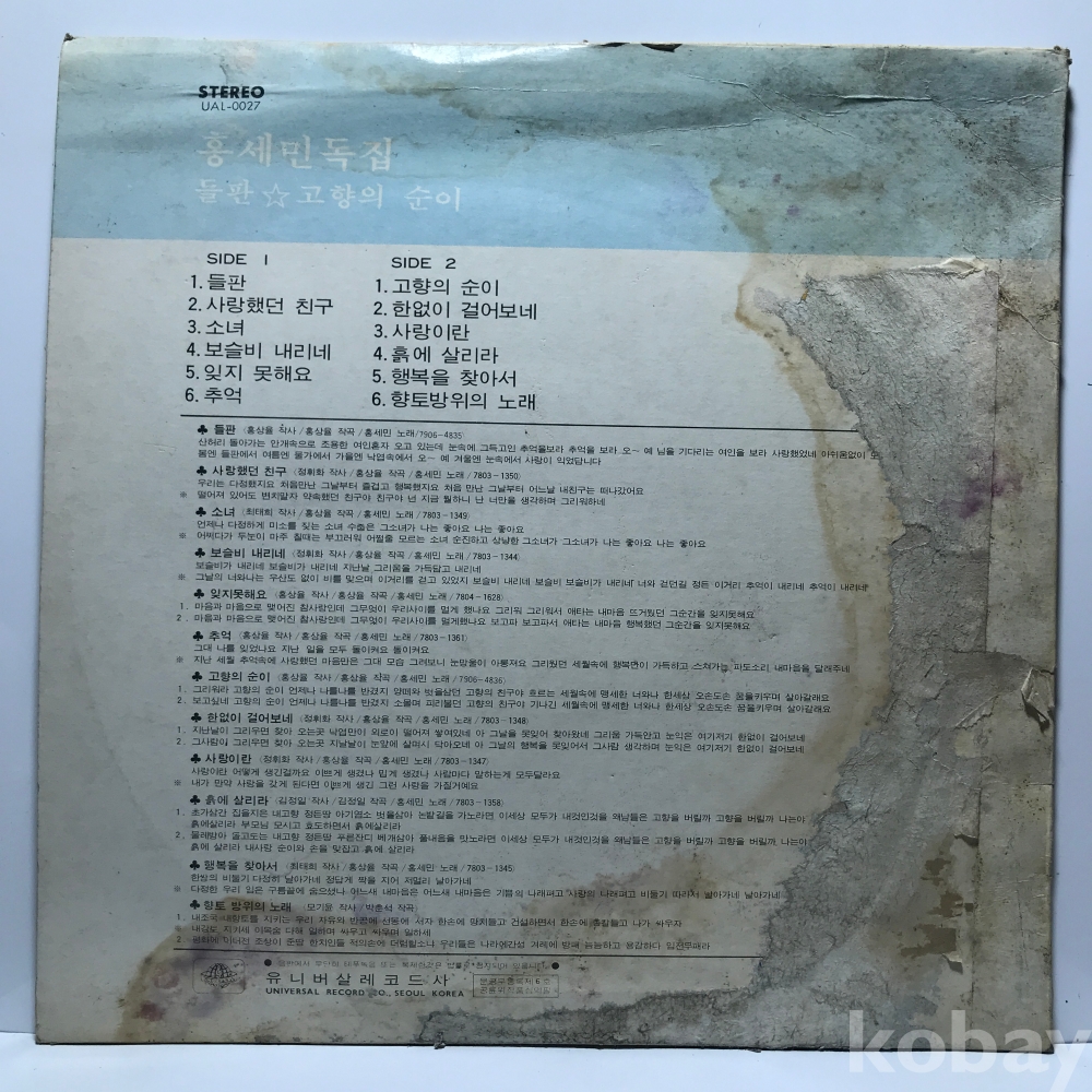 | 자켓상태 | VG : 주름, 접힘, 모서리 찢김 다수 | 음반상태 | EX : 재생에 영향 없는 가벼운 기스 존재 | 발매정보 | 알수없음 | 가사지여부 | 무 |