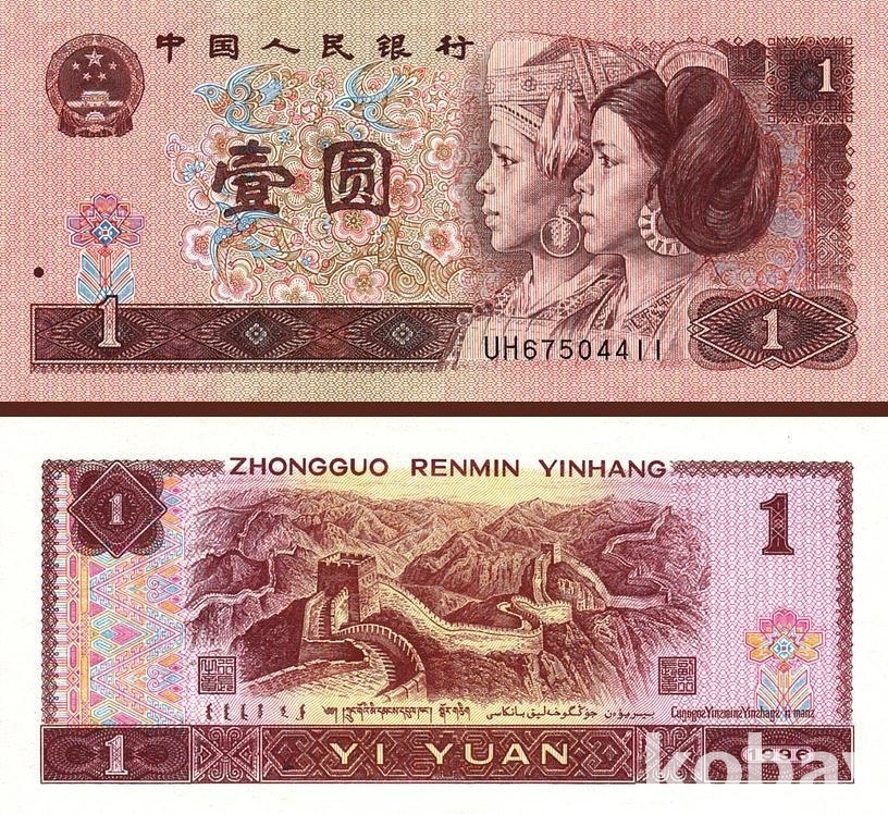 중국 1 위안 (Yuan) 만리장성 1996년 완전 미사용