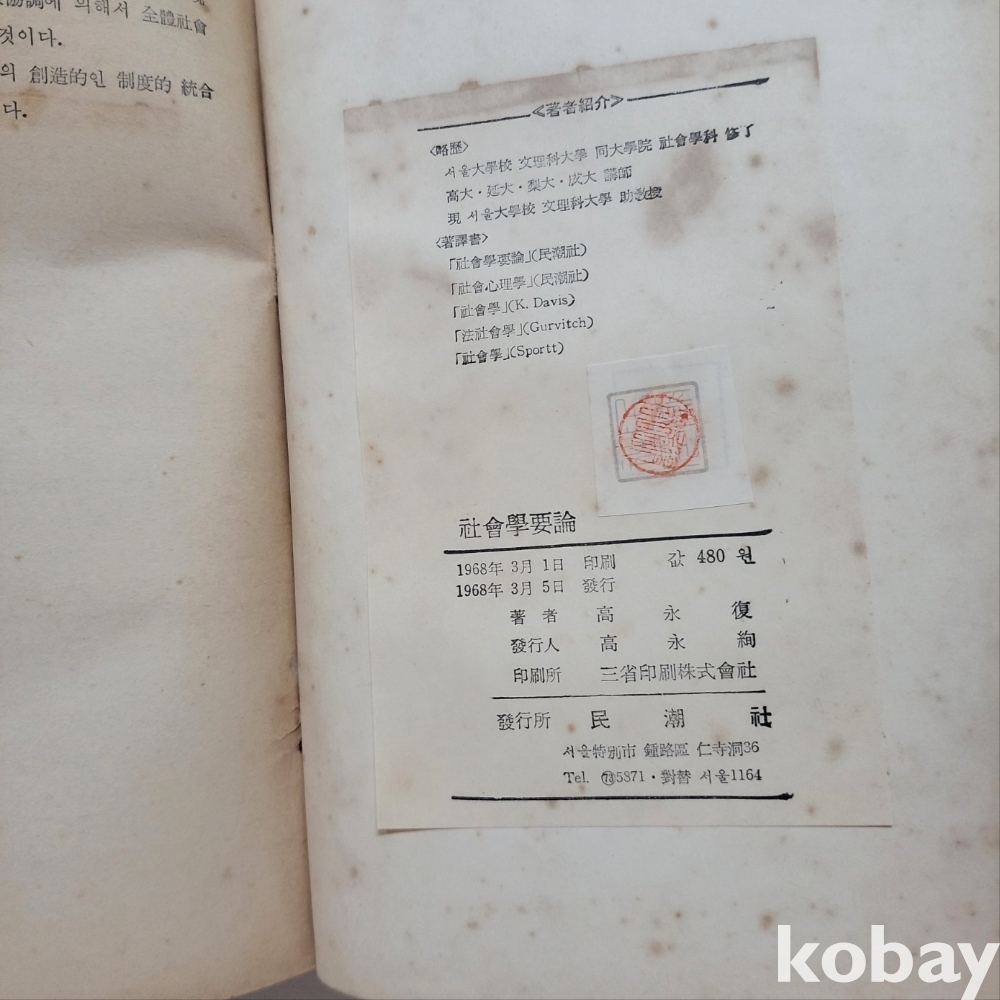 [천원경매] 1968년 발행된 사회학개론 입니다.