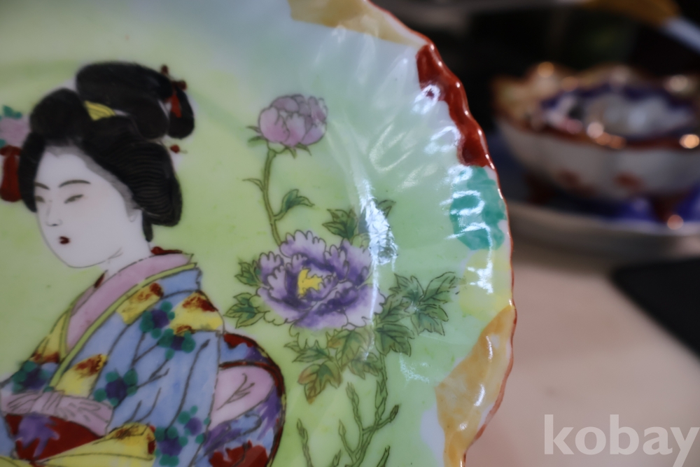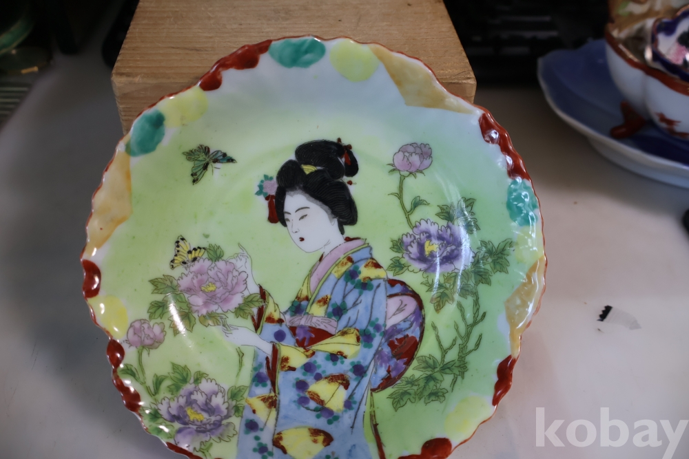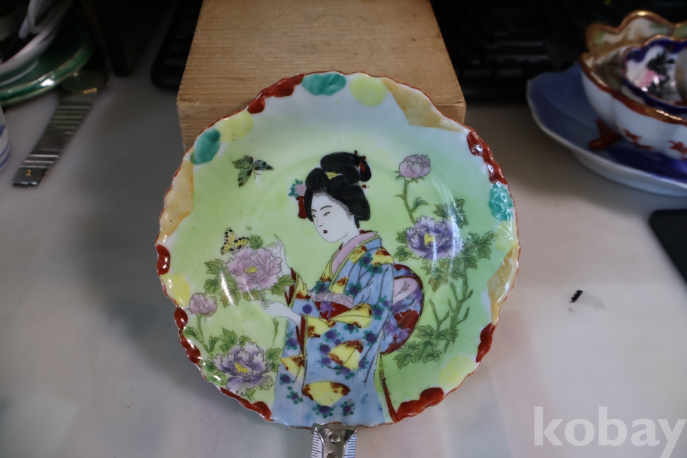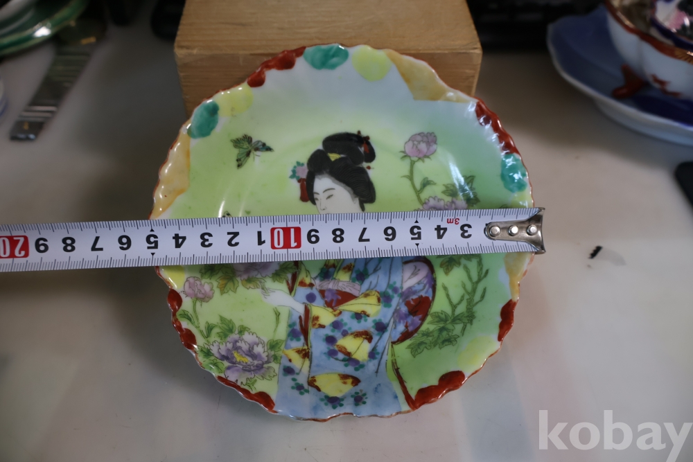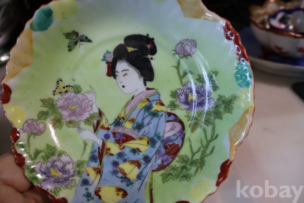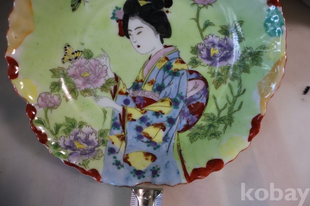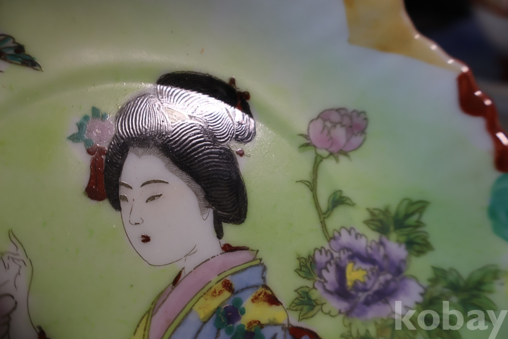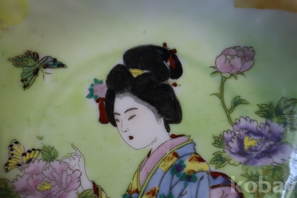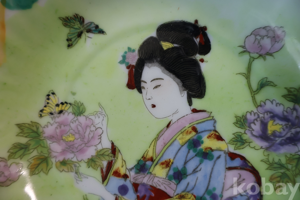 아름다운 명품 미인 접시 임니다 섬세 정교 화려함 등등 명치기 혹은 1920대의 일급 도자기 임니다 게이샤와 화접도의 명품 임니다