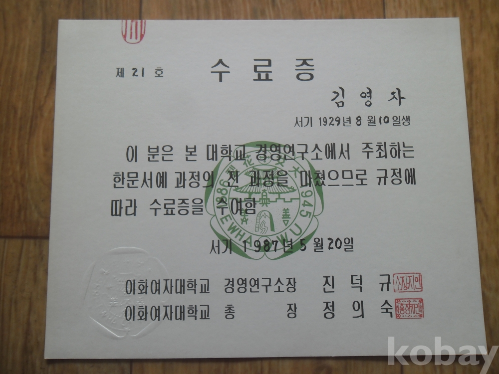 1980년 이화여대 경영연구소 한문서예과정 수료증