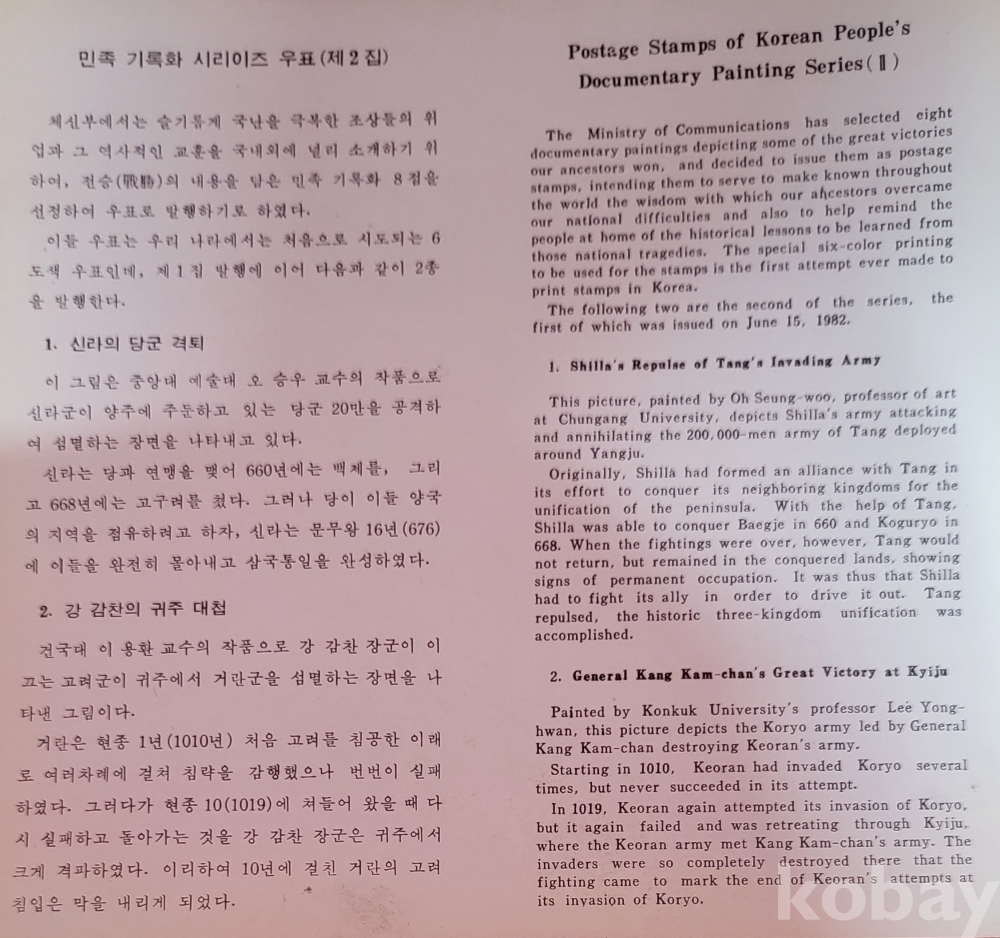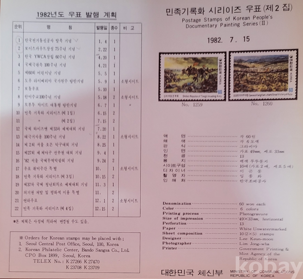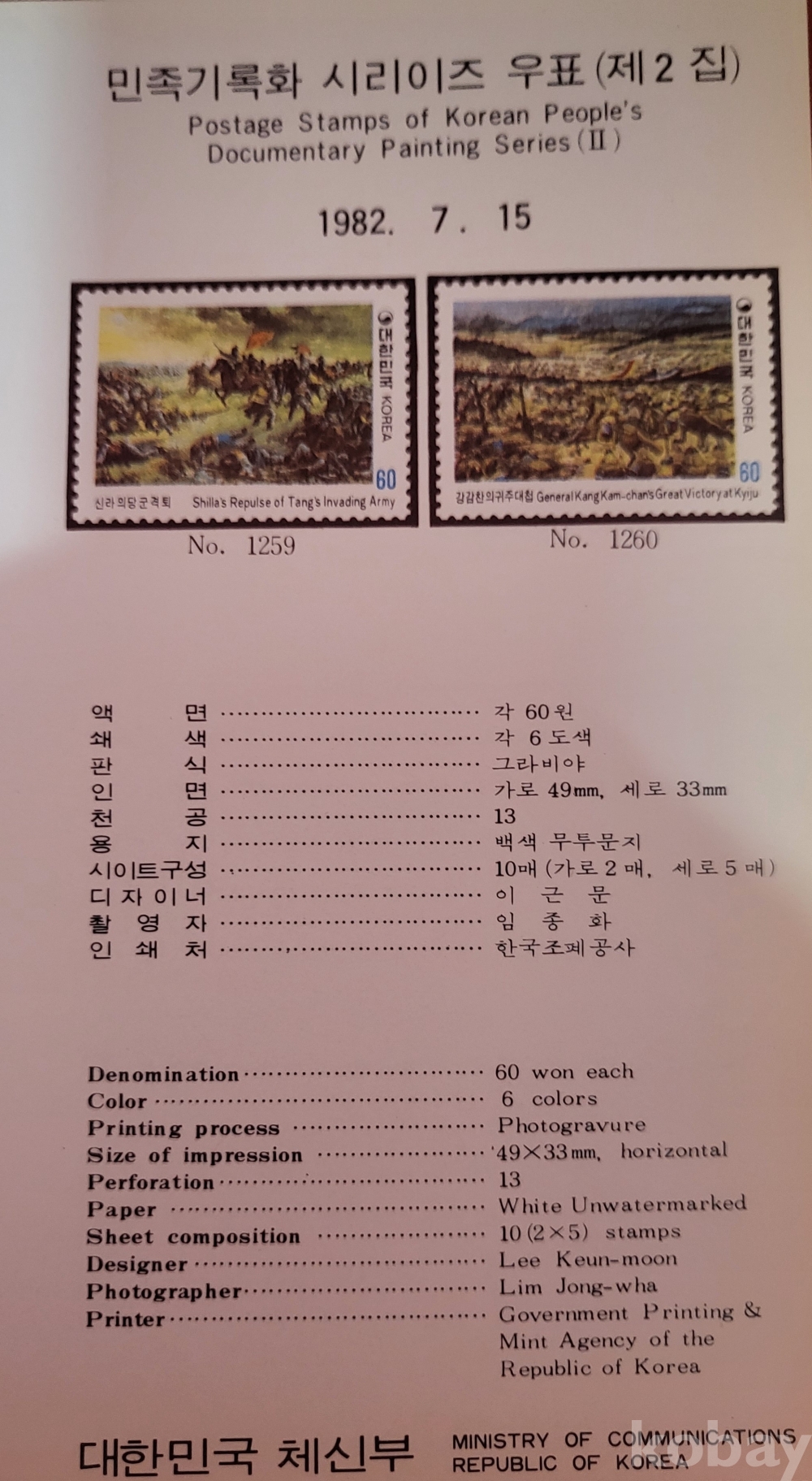 대한민국 체신부 발행 1982년 우표 예시표로 우표수집 애호가님들에게는 매우 귀한 보배같은 자료입니다,