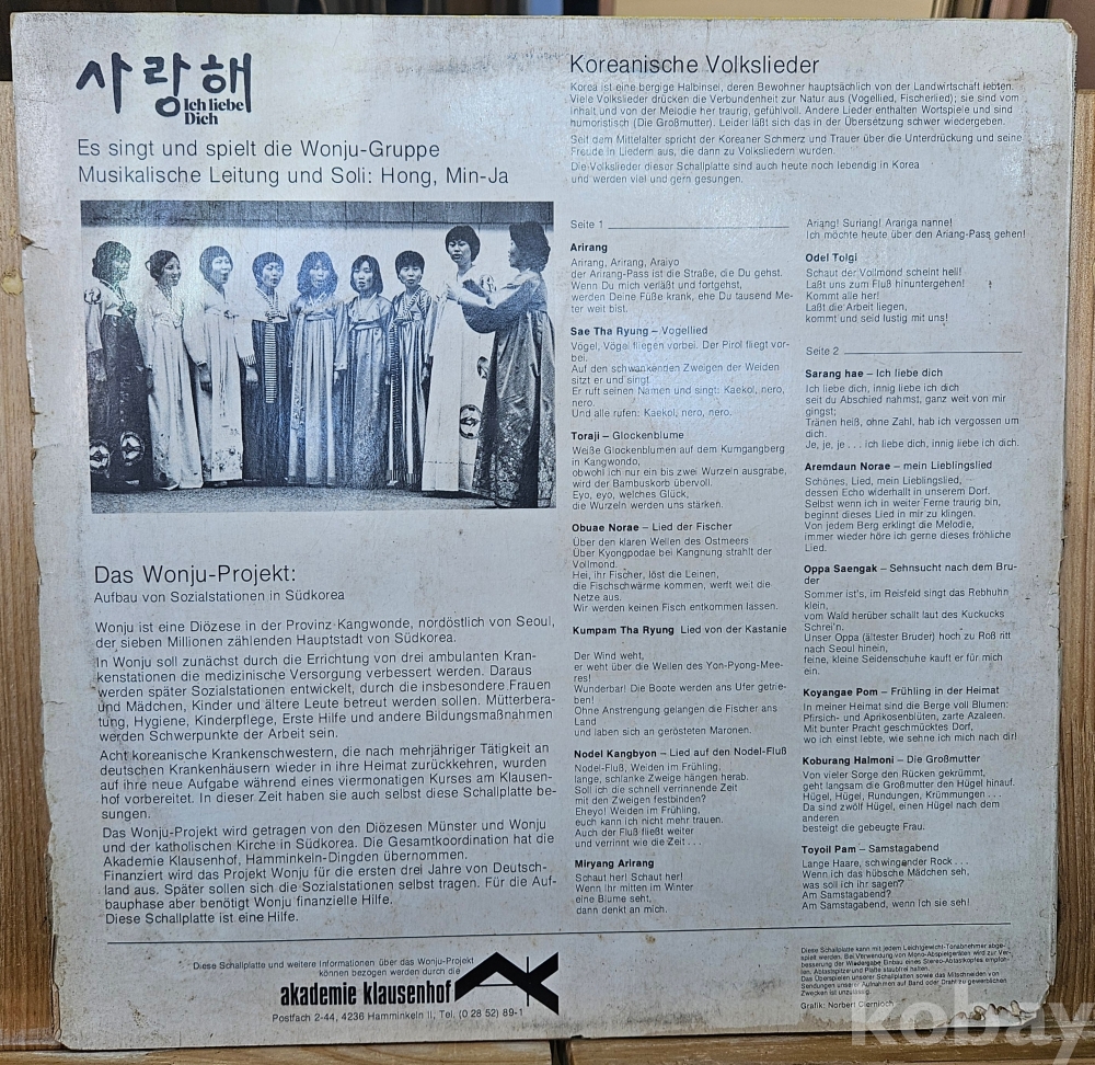 원주출신의 파독 간호사 들이 독일현지에서 벽지 보건 사업비 확보를 위해 독일에서 녹음한 귀중한 자료 음반 입니다. 민요가 수록되어 있는 명반 입니다.