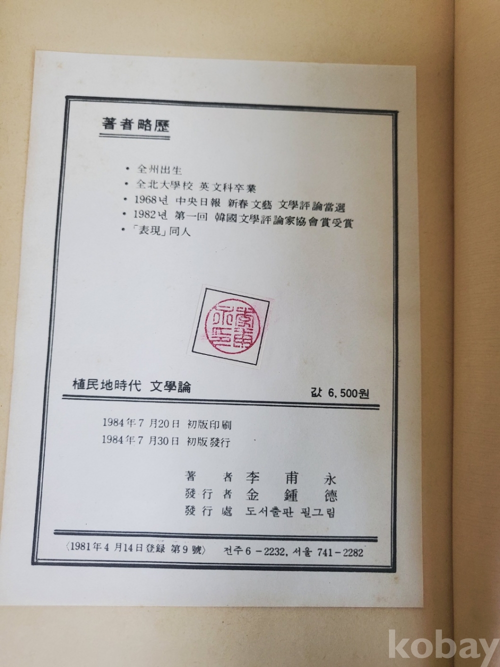 1. 식민지시대문학론 - 소설을 중심으로, 이보영, 도서출판 필그린, 1984년, 493쪽, 상태 상, 사진 참조