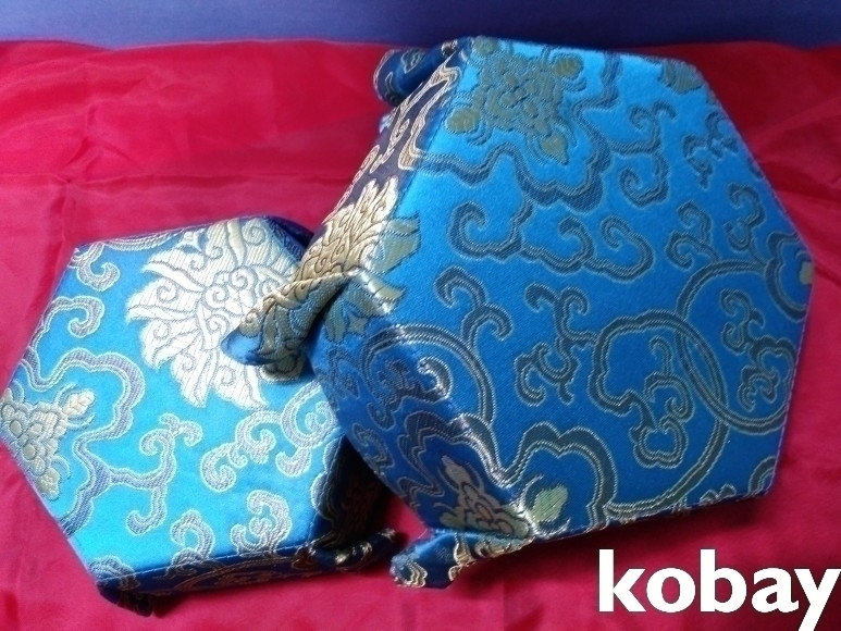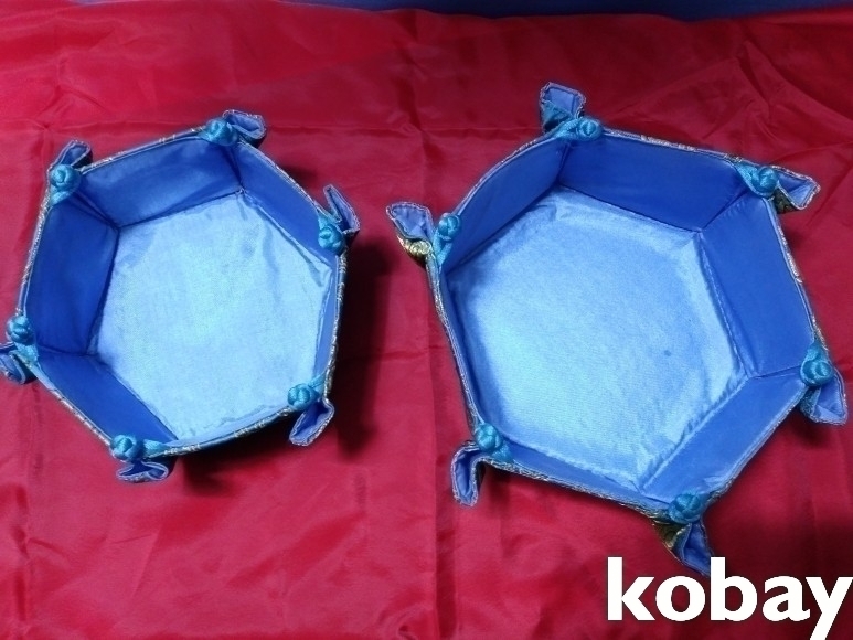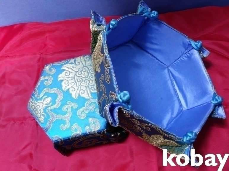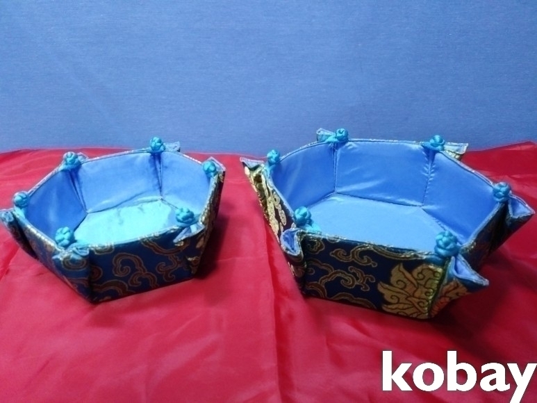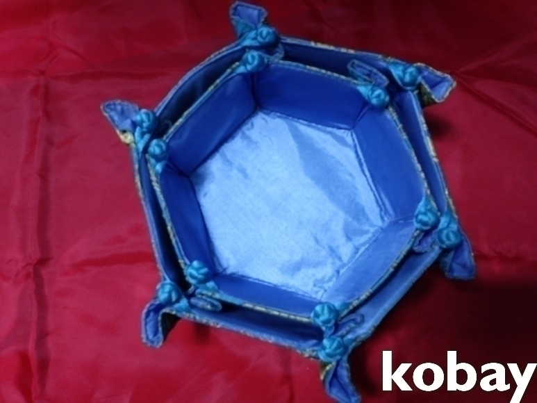 파란 비단 천에 매듭과 6각으로 멋을 낸 바구니 입니다.