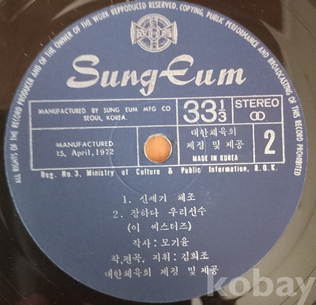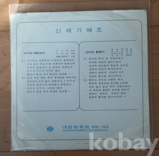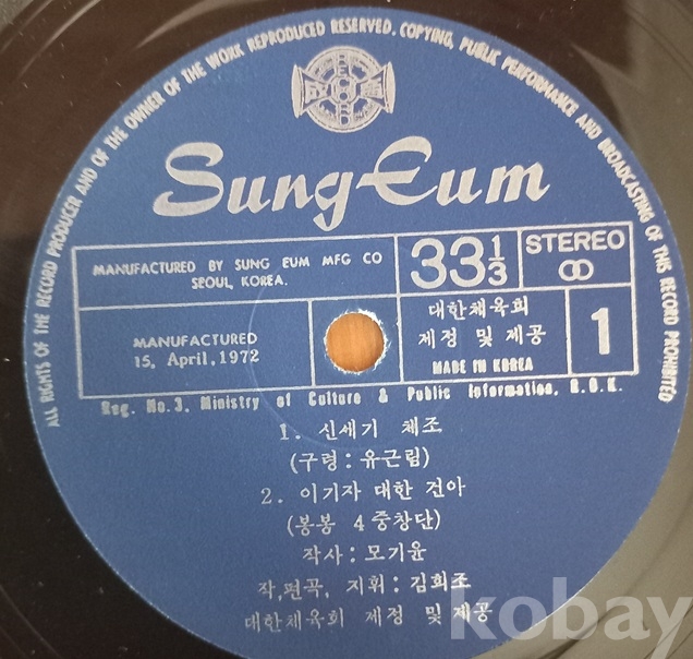 쟈켓과 디스크 모두 세월에 비해 너무 좋아 보입니다. 국내 체조음반은 1950년 무렵 일본으로부터 "라디오체조" 수입을 추진중에 6.25동란으로 중단되고 이후 군사정부의 "재건체조"반, 그리고 이 "국민체조"반, "신세기체조"반도 있었다 하고.. 한편 군에서는 따로 "국군도수체조"반이 나왔고 그 외 일설에는 "가정체조"반도 있었다 하는데 저는 구경도 못하고.. 점점 귀해져 가는 자료들로서 소중한 음반들입니다. 트랙 등 모든게 사진에 다 있읍니다 아주 여러장을 올렸읍니다.