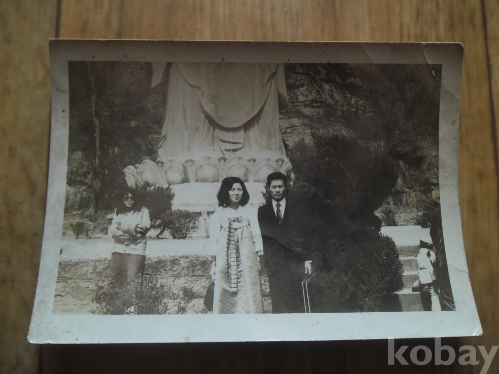 흑백사진: 석불상 앞에서
