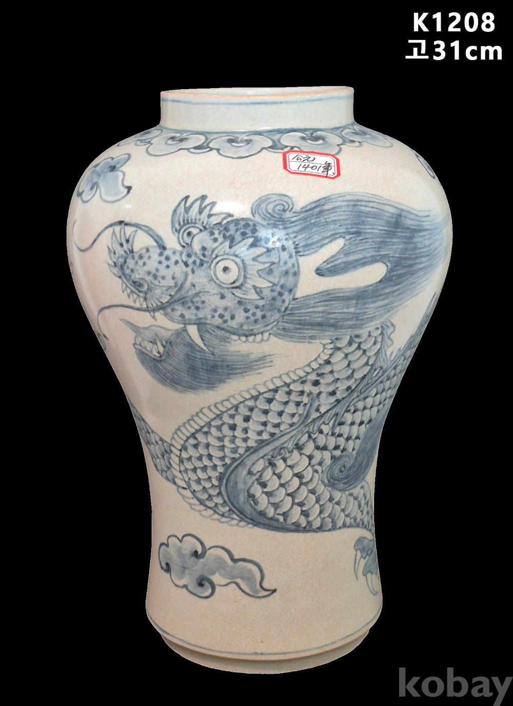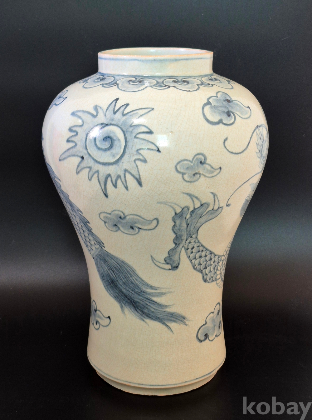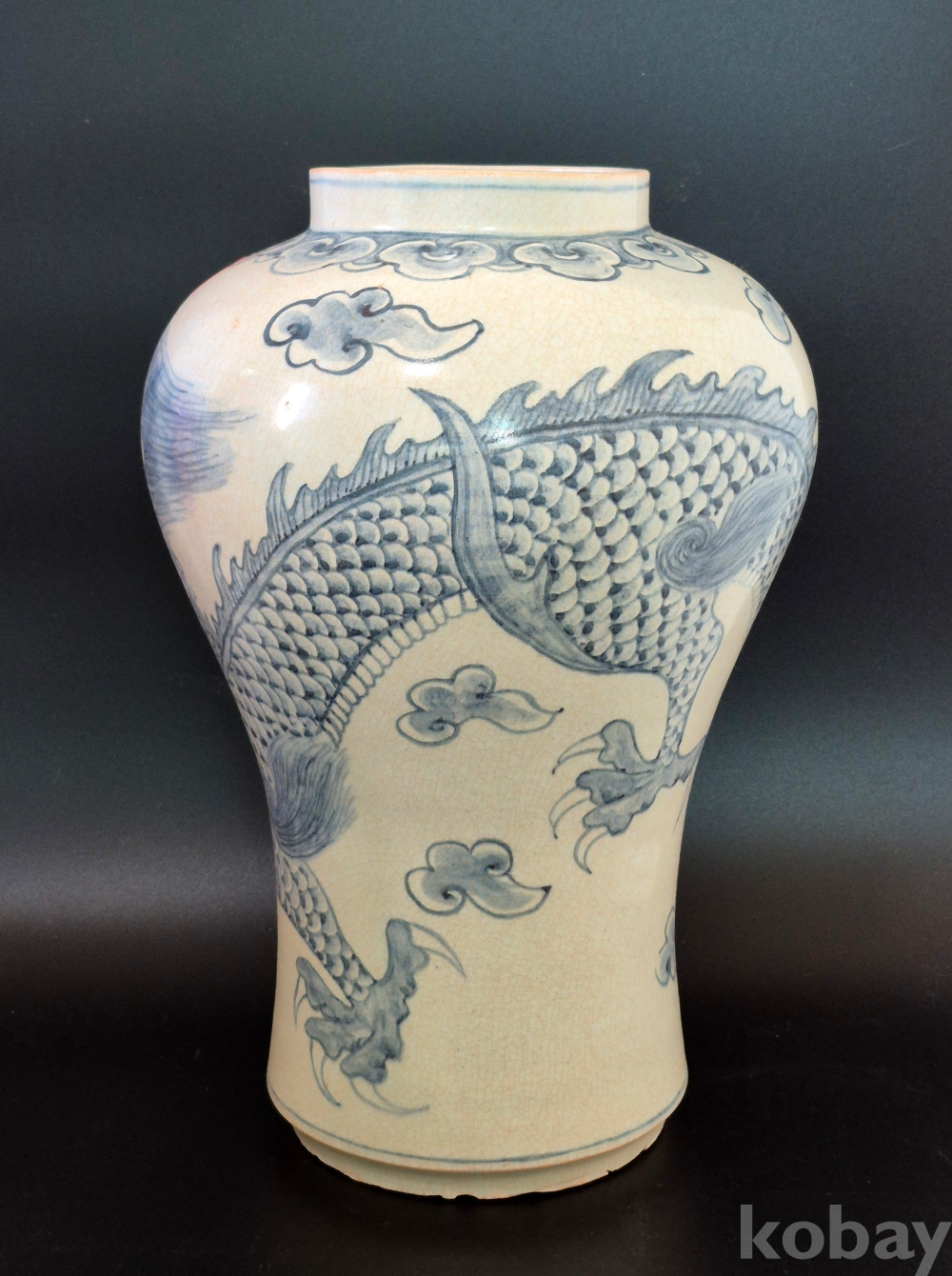 매혹적인 자태의 매병에 4과룡이 여의주를 희롱하는 보기 드문 청화백자 입니다.