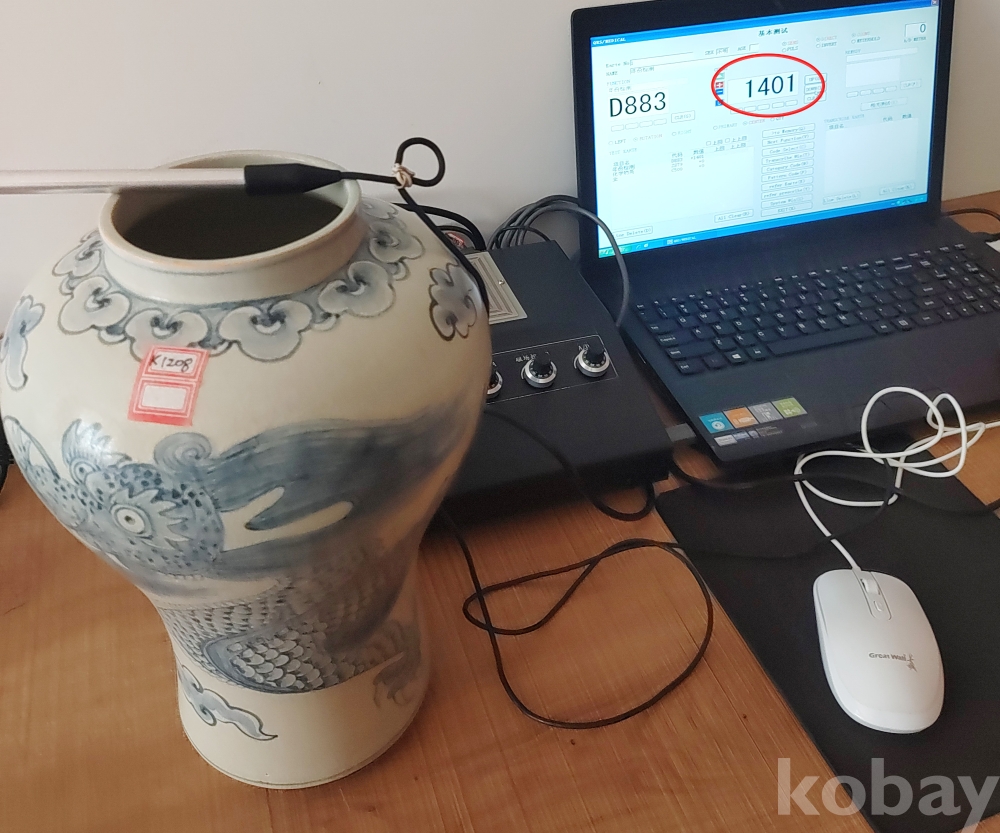 이 백자를 “양자검측(QRDS: Quantum Resonance Dating System)”한 현장 사진을 올려 드렸는데, 결과는 1401년 조선 건국한지 10년도 되지 않은 해 입니다. 1401년 이면 고려에서 조선으로
