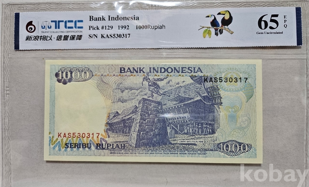 -1992년 인도네시아 1000루피아 지폐 TCC65 등급 입니다.