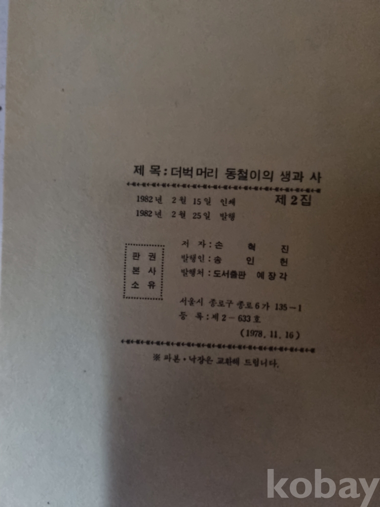 더벅머리 동철이의 생과사(제2집) 손혁진 예장각 1982