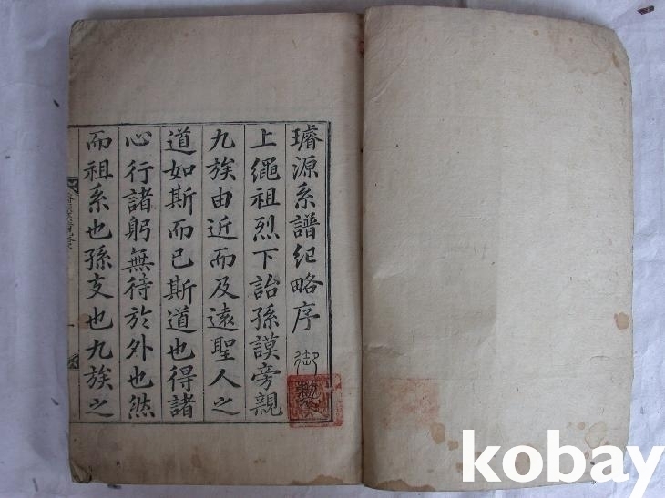 ▒ 표지에 <璿源譜略>이라고 제목을 써넣었으나 바로 이어지는 어제 서문 <璿源系譜紀略序>에 보이는 바와 같이 원제는 <璿源系譜紀略>이다. 서문 제목 아래 전서체로 '御製'라고 적혔으며 6행 기준으로 행자수 10자로 해서체의 큰 글자이다. 끝에 "小子嗣服之七年癸卯孟春上元拜手謹序"라고 써 정조 7년(1783년)에 정조가 손수 쓴 것임을 알 수 있다. 그 다음 공란에 큼지학한 '奎章之寶'라는 도서가 먹으로 찍혀 있다.