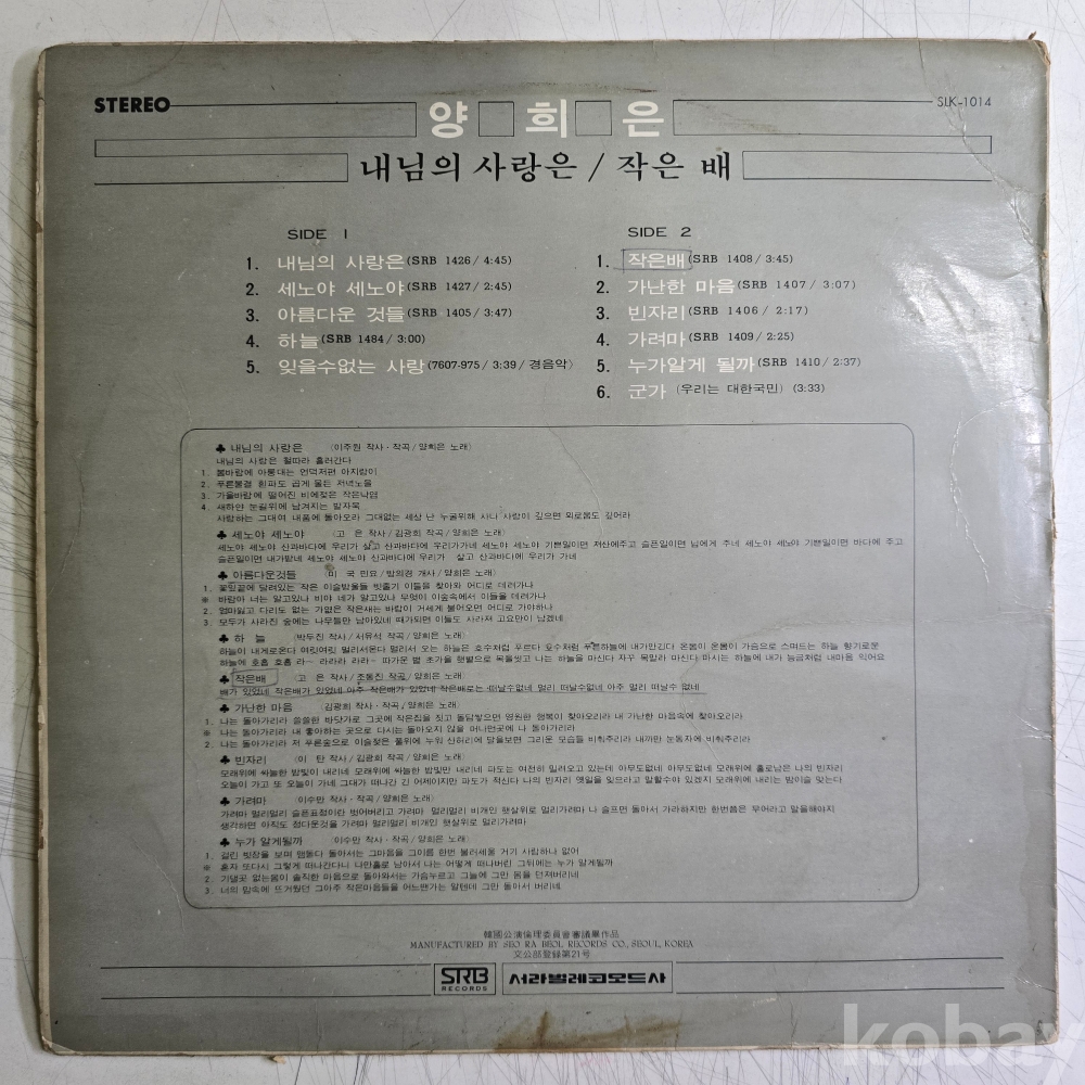 | 자켓상태 | VG : 주름, 접힘, 모서리 찢김 다수 | 음반상태 | VG : 생활 기스 다수, 가벼운 노이즈 존재 | 발매정보 | 초반 | 가사지여부 | 무 |
