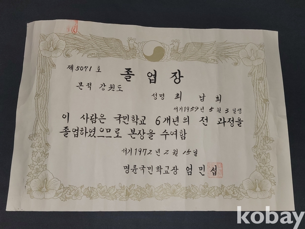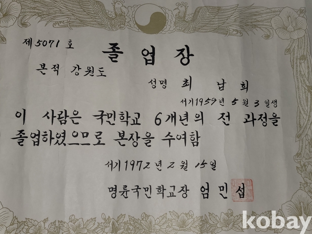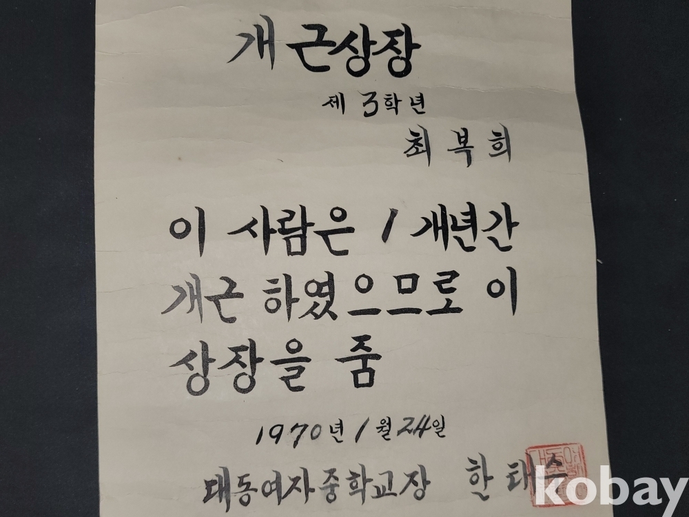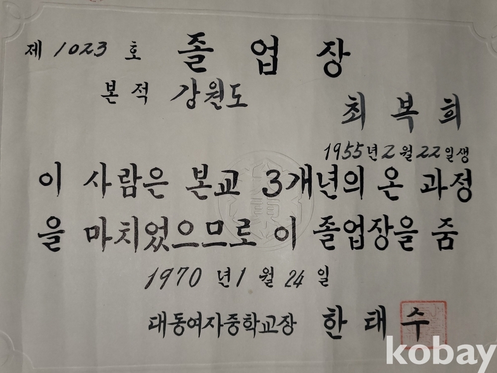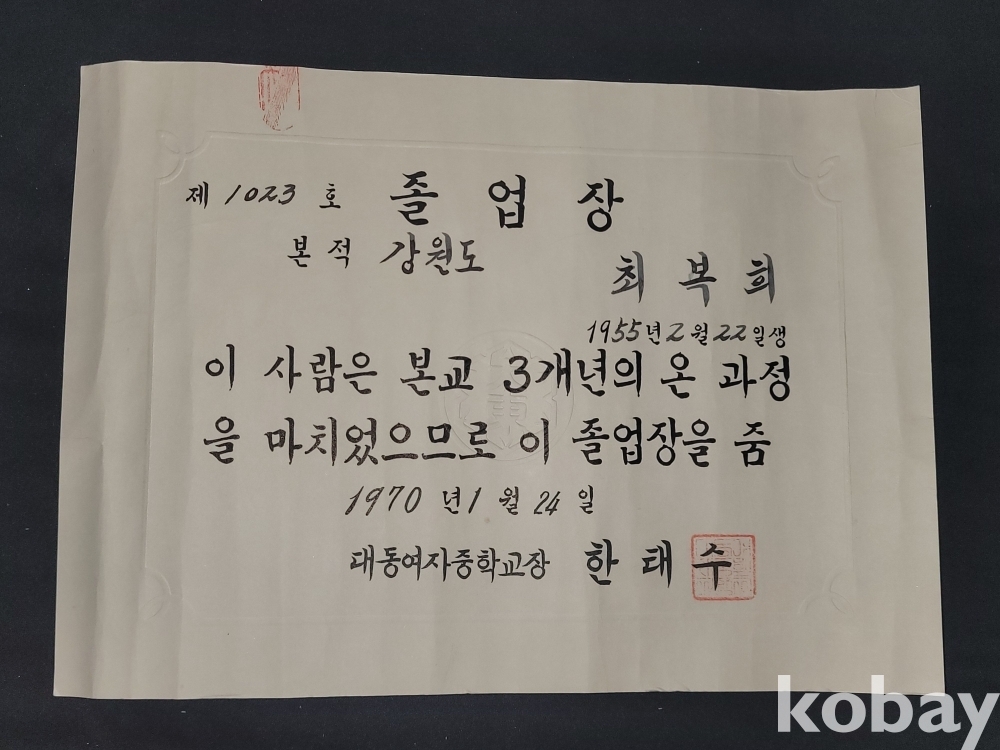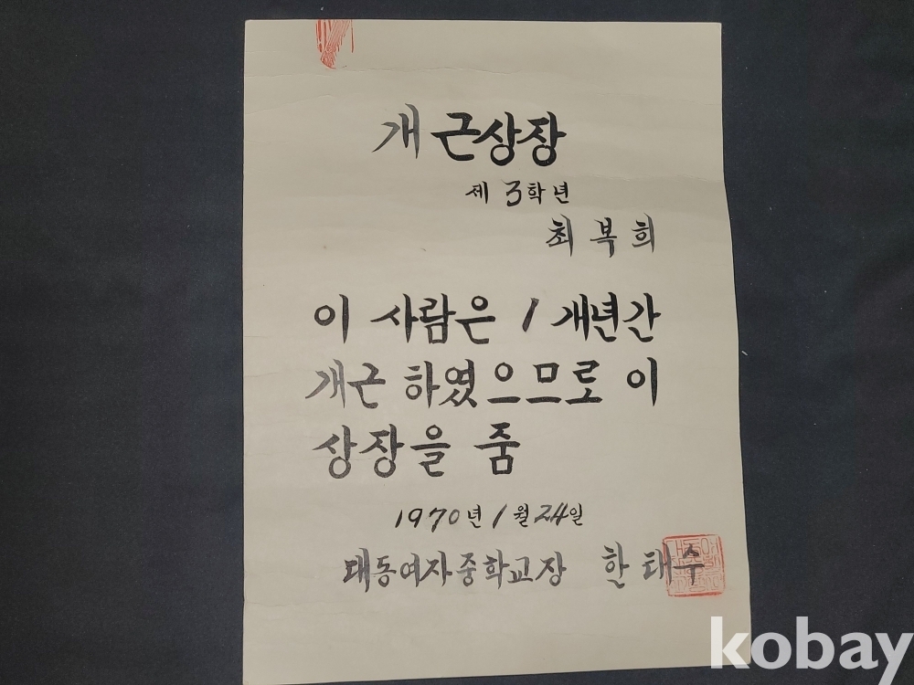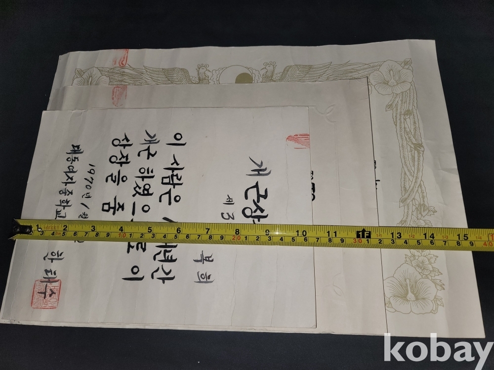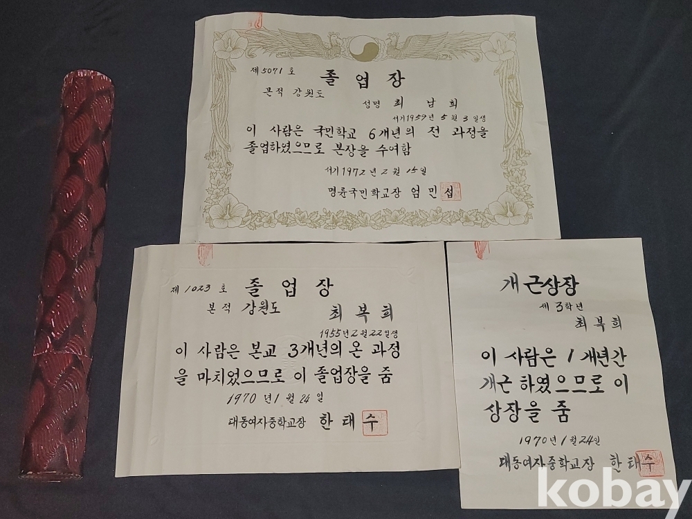 빈티지 세월 감이 느껴지는 1972년 명륜국민학교 졸업장, 1970년 대동여자중학교 졸업장, 1970년 대동여자중학교 개근상 등 3종 일괄입니다.
