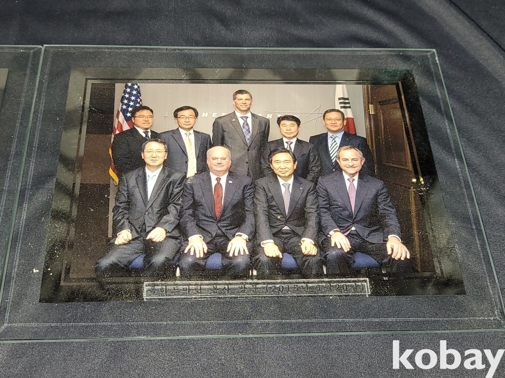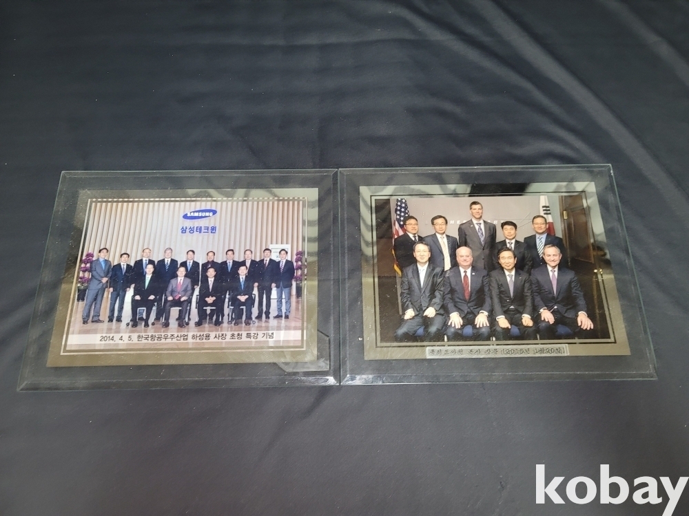 2014년 한국항공우주산업 하성용 사장 초청 특강 기념 사진액자와 2015년 록히드 마틴 본사 방문 기념 사진액자입니다.