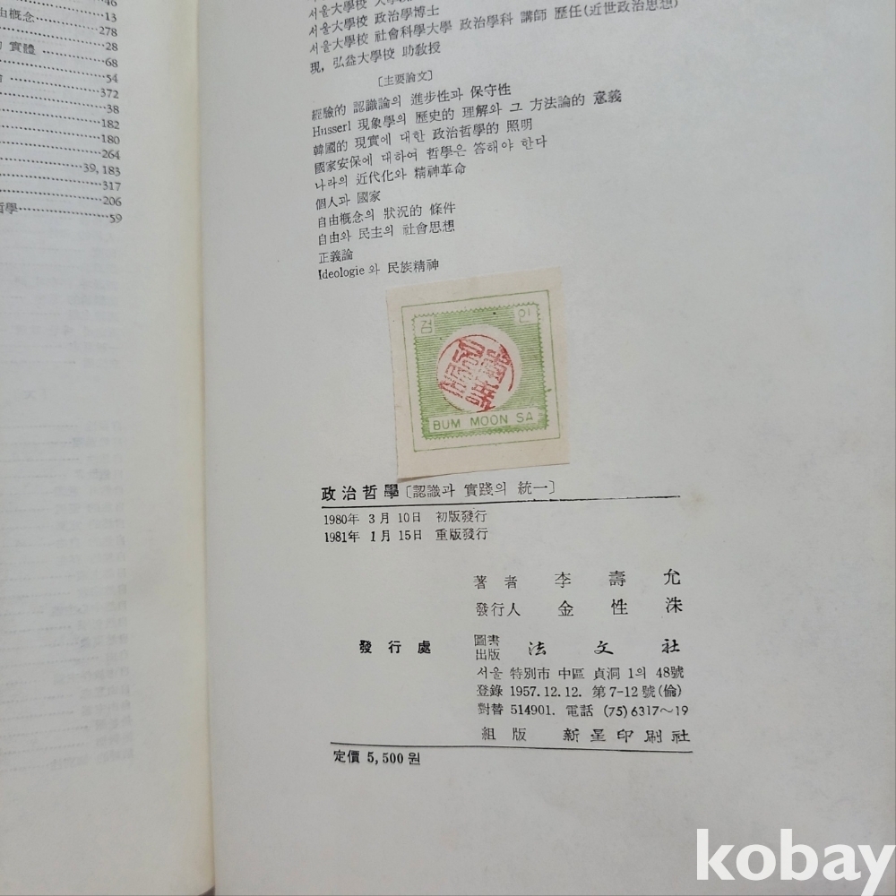 [천원경매] 1971년 법문사 발행 도서 '정치철학'
