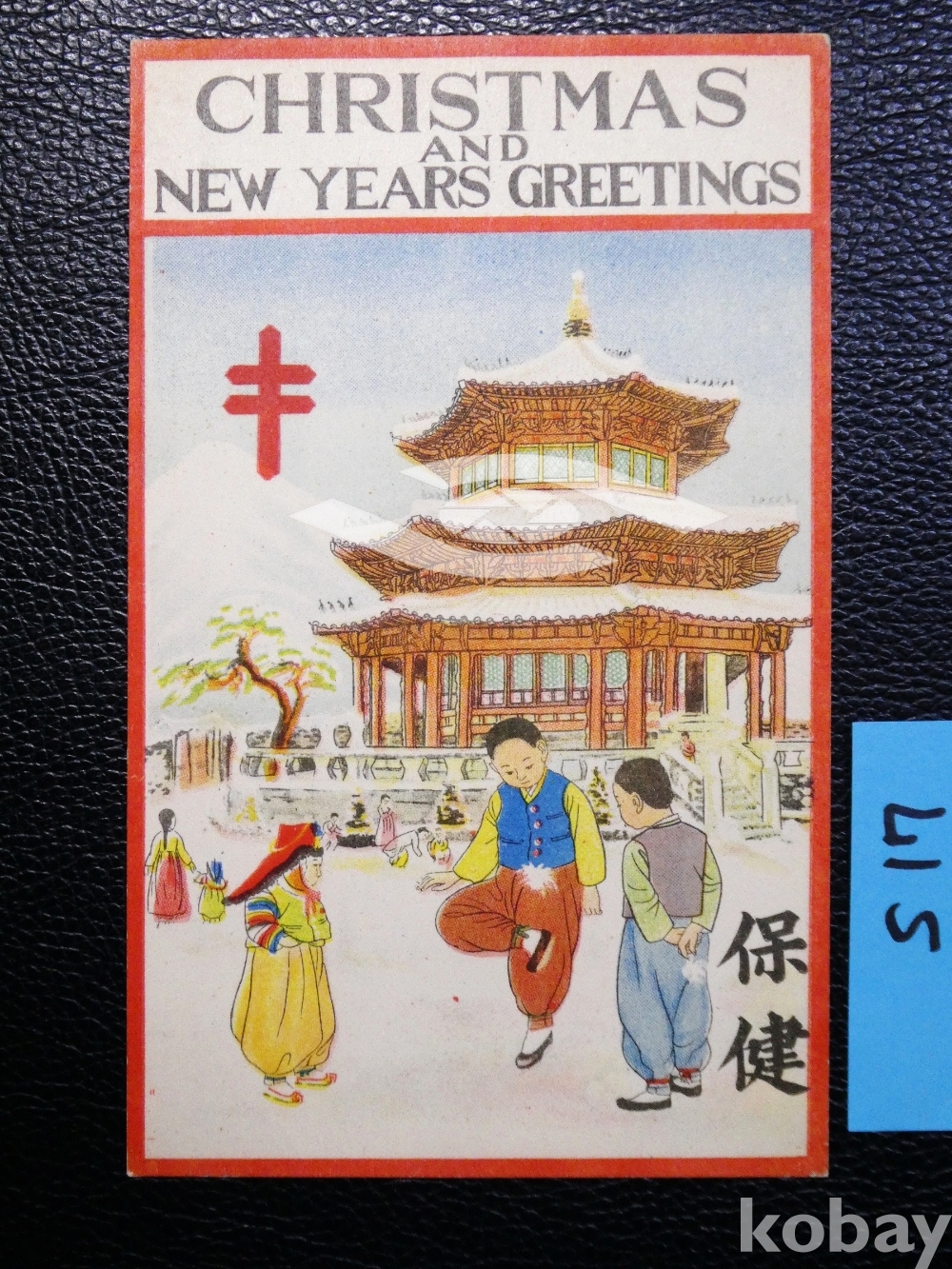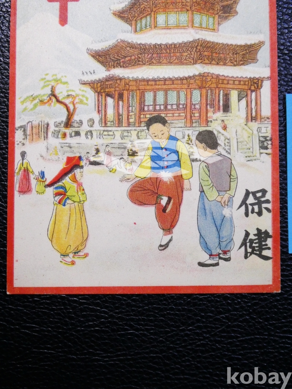 ▣해주구세요양원 1938년 <제기차기> 크리스마스씰의 엽서(대형). 셔우드 홀 박사 제작, 김기창 도안, 매우 귀함. 상태 좋음. S17