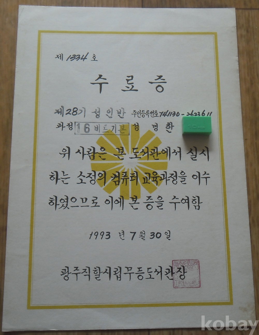 1993년 광주시립무등도서관 컴퓨터교육과정 수료증