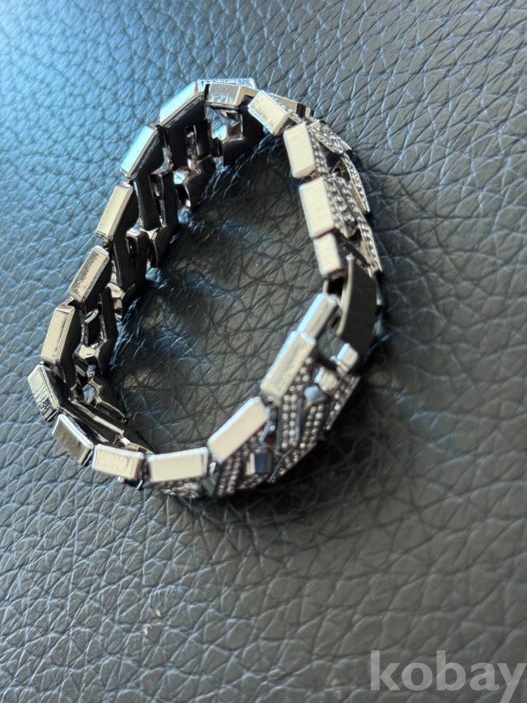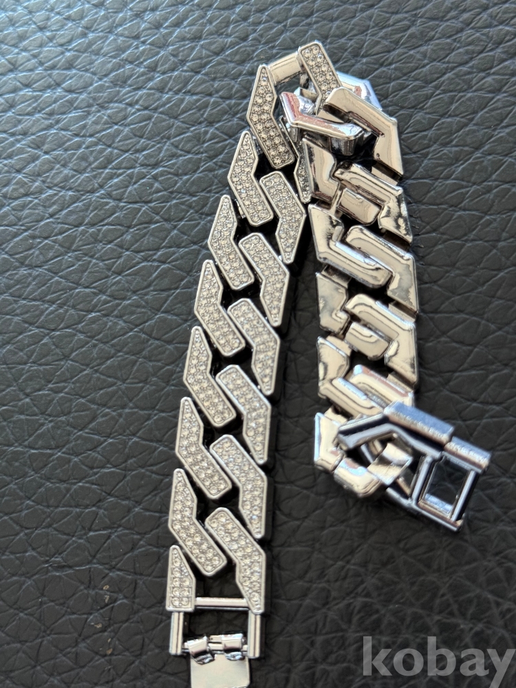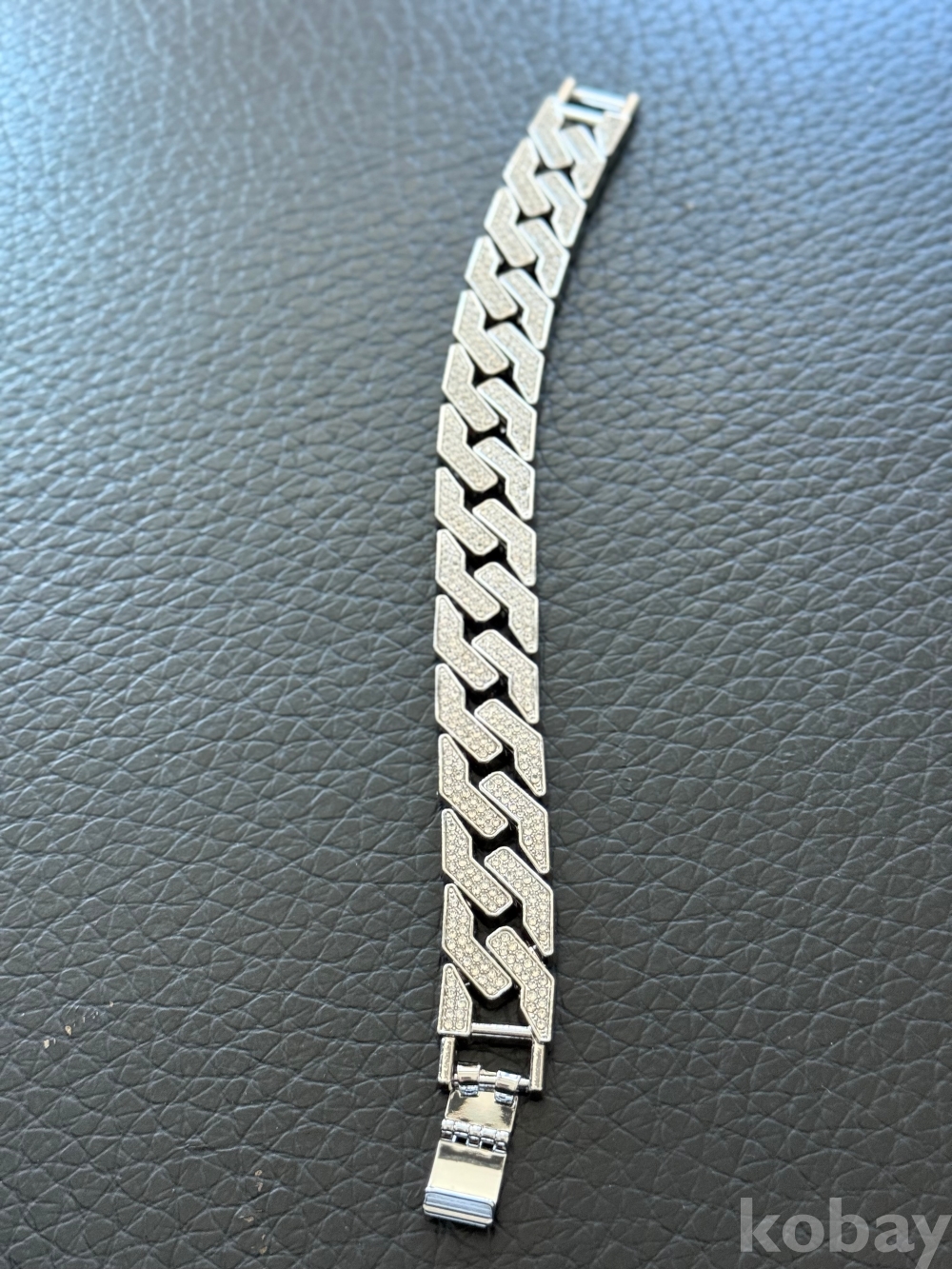 두꺼운편이며.은색상 팔지입니다.큐빅? 보석이 밖혀잇는