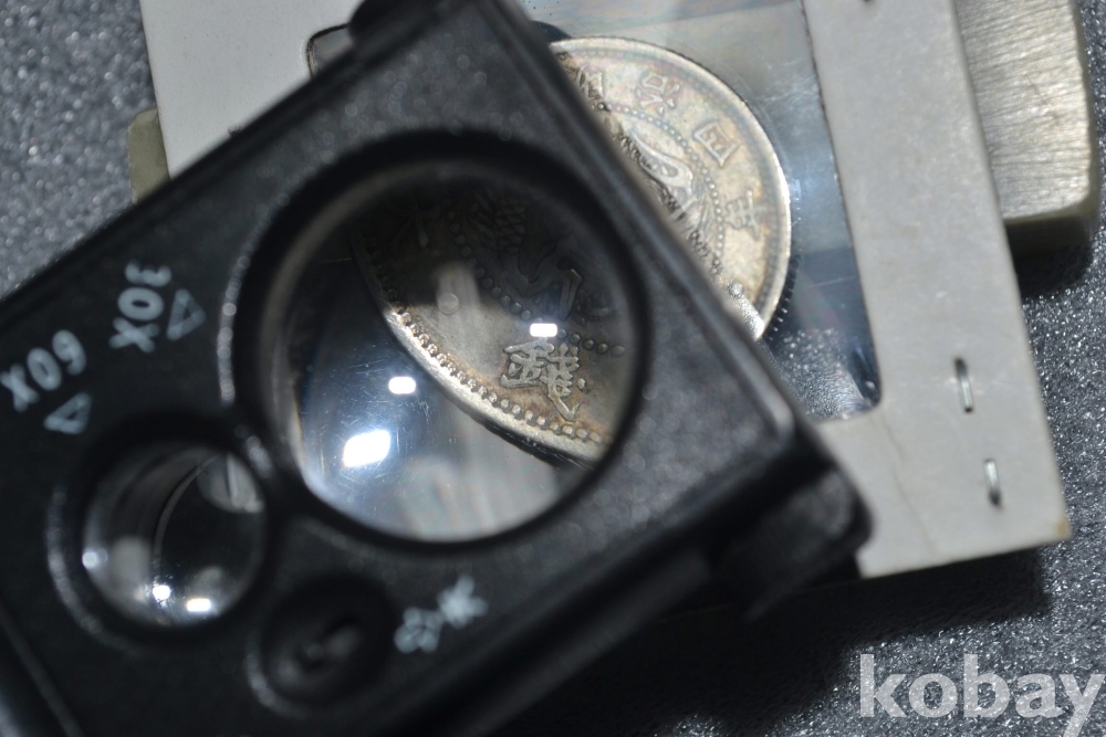 " 결전,흠전(欠錢) " 은 글자에서 " 錢 " 자에 아래쪽 끝부분 삐져나온 삐침부분이 아예 극인으로 안찍힌 상태의 욱일20전 은화 종류 입니다. (검은핀으로 가르킨 부분 사진참조)