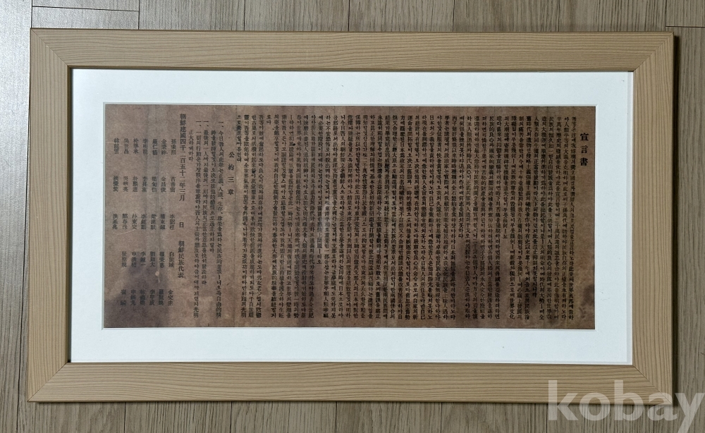 본 작품은 1919년 3.1운동 당시 발표된 독립선언서를 원본 형태 그대로 재현한 영인본 자료로, 민족대표 33인의 서명과 선언문 전문이 포함된 역사 기록물 복제본이다. 원본은 국보급 사료로 지정되어 있으며 본 출품작은 교육용 및 소장용 목적으로 제작된 인쇄 복제본이다. 액자 상태로 보관되어 있으며 전체 크기 57 x 33cm로 벽걸이 전시가 가능한 구성이다. 보존 상태는 양호하며 종이 노화감과 빈티지 톤이 자연스럽게 표현되어 있어 역사적 분위기가 잘 살아있는 자료형 인테리어 소장품으로 적합하다. 실물 원본이 아닌 영인 복제본임을 전제로 한 컬렉션용 자료이다.