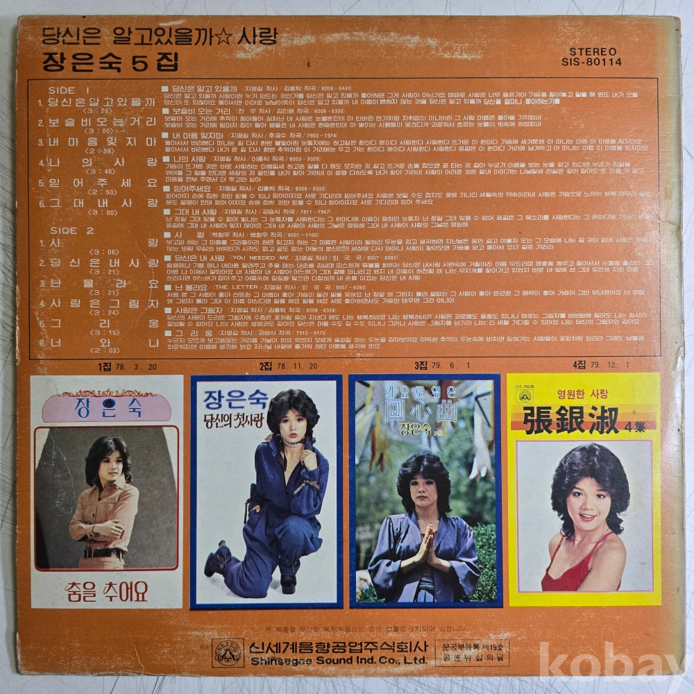 | 자켓상태 | VG : 주름, 접힘, 모서리 찢김 다수 | 음반상태 | VG : 생활 기스 다수, 가벼운 노이즈 존재 | 발매정보 | 초반 | 가사지여부 | 무 |