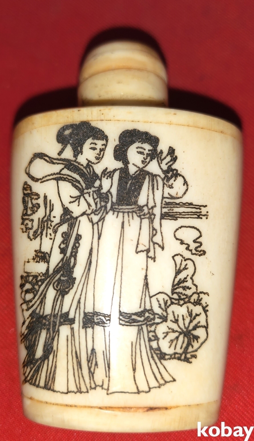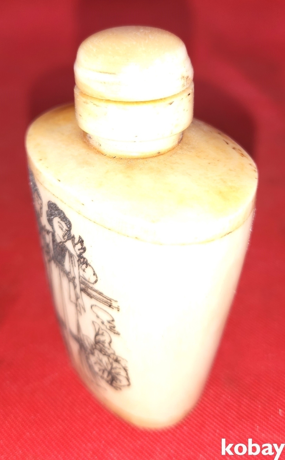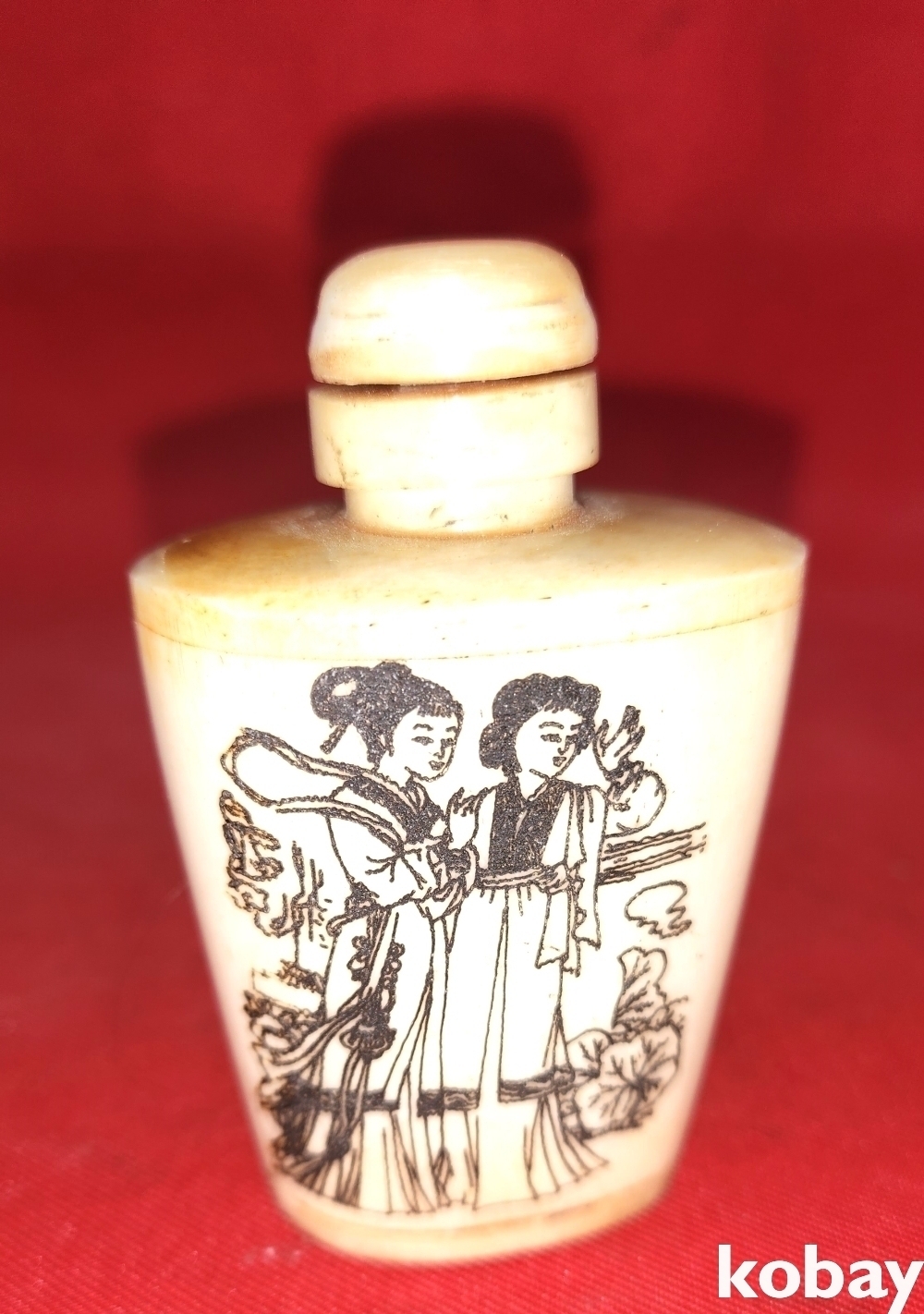 짱짱한 연대 갖춘 동물 뼈로 완성된 미인도 문양 비연호(鼻烟壶)입니다,