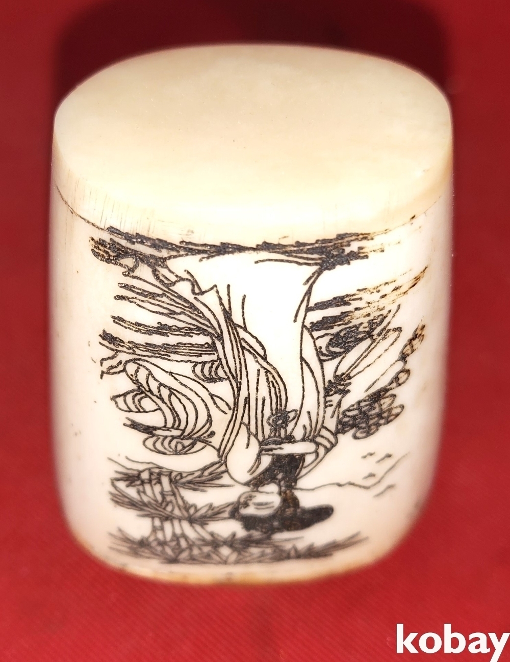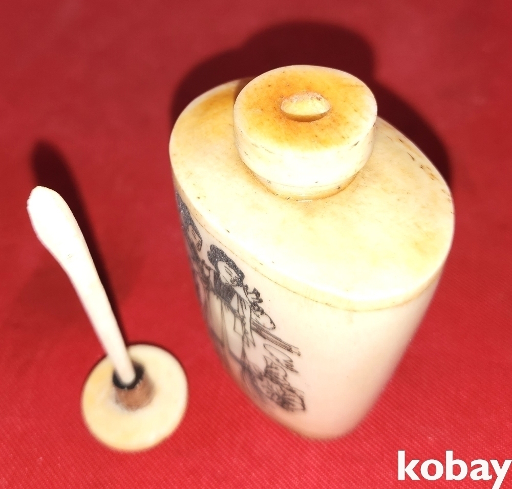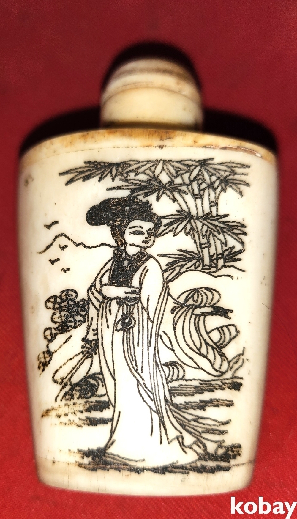 짱짱한 연대 갖춘 동물 뼈로 완성된 미인도 문양 비연호(鼻烟壶)입니다,