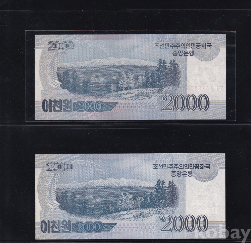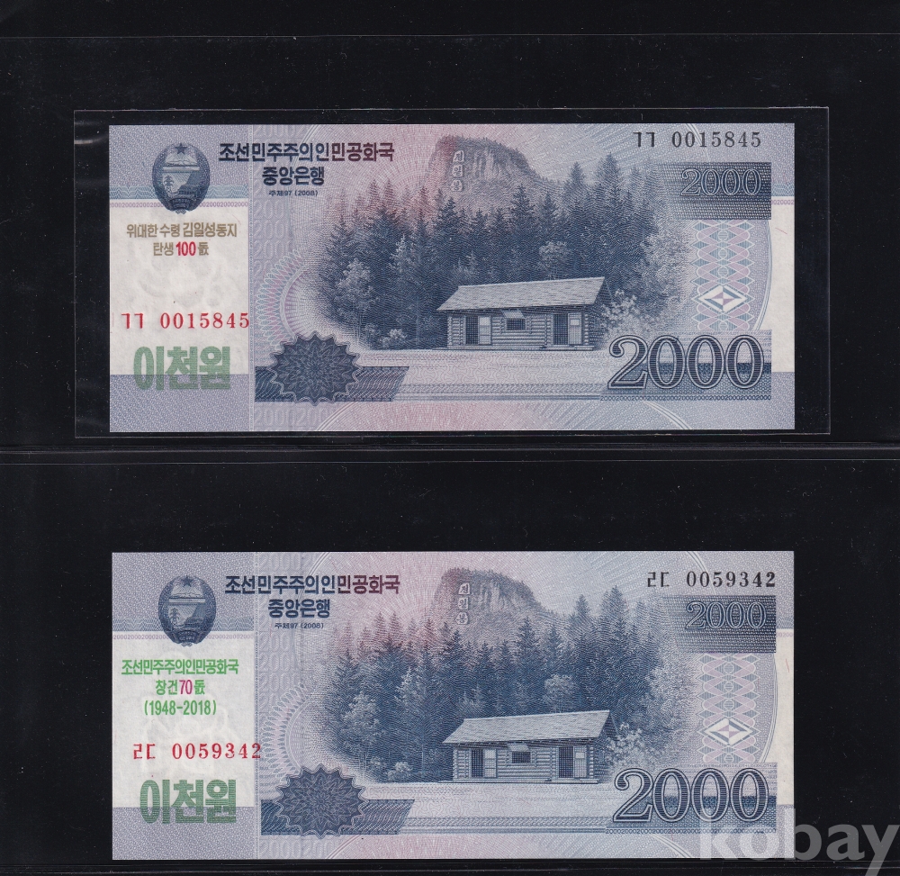 - 윗동네 2008년 김일성 동지 탄생 100돐 기념 일원/ 조선민주주의 창건 70돐 이천원 미사용 지폐 - 2장 일괄