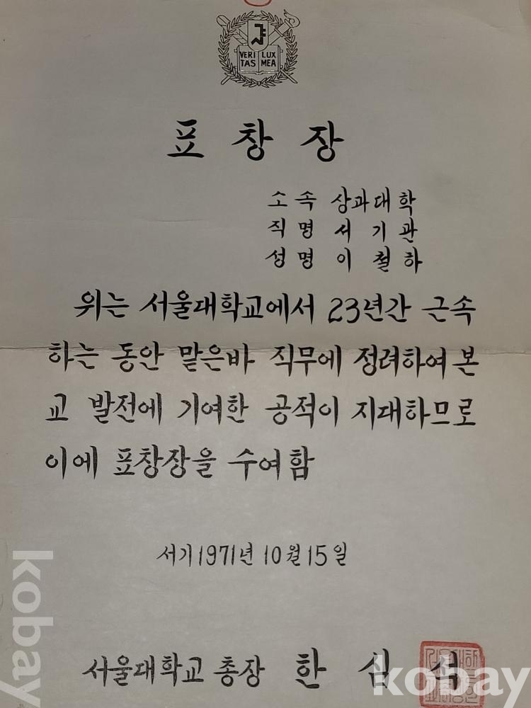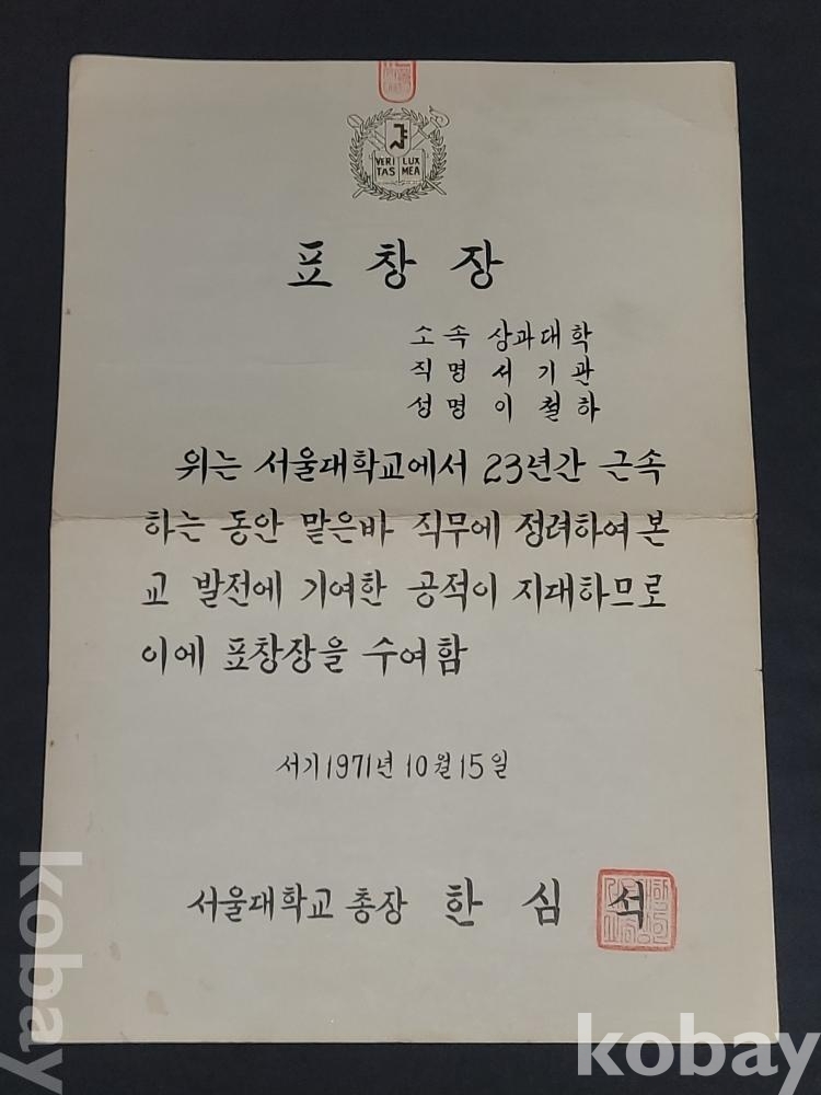 빈티지 희귀한 1971년 서울대학교 상과대학 서기관 23년 근속 표창장 자료입니다.