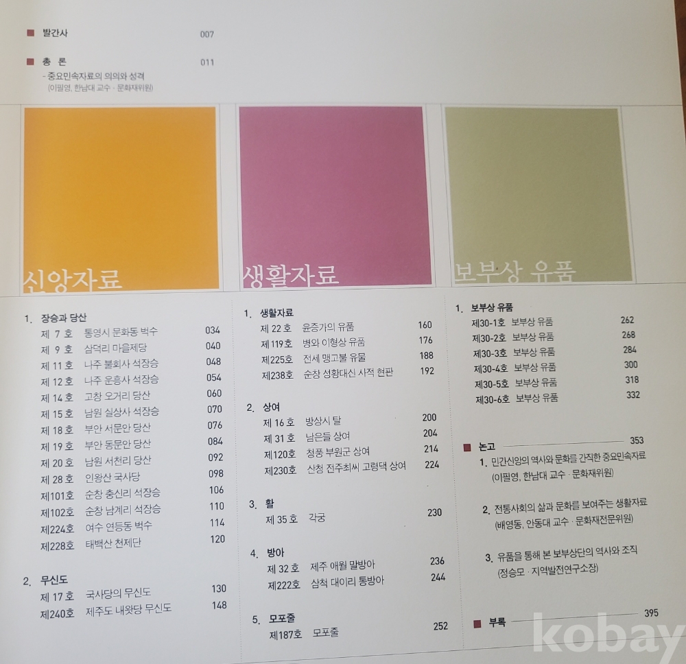 2. 차례 : 총론(중요 민속자료의 의의와 성격) / 신앙 자료(장승과 당산, 무신도) / 생활자료(생활자료, 상여, 활, 방아, 모포줄) / 보부상 유품 / 논고 / 부록
