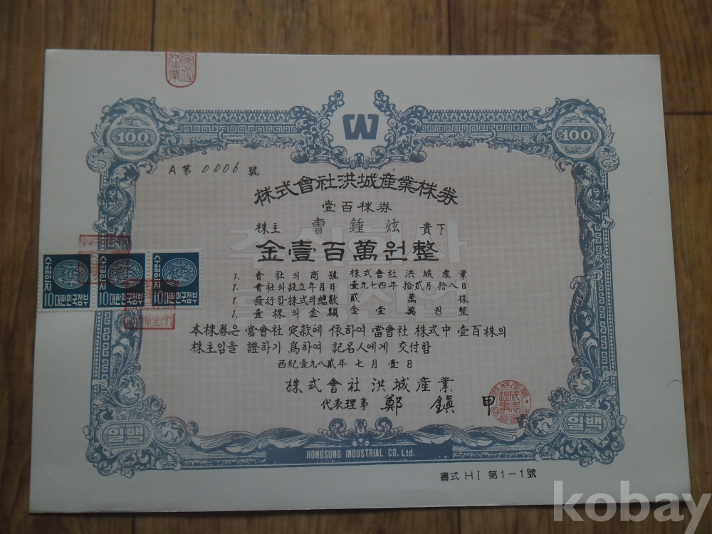 1982년 발행 홍성산업 주권 한 장