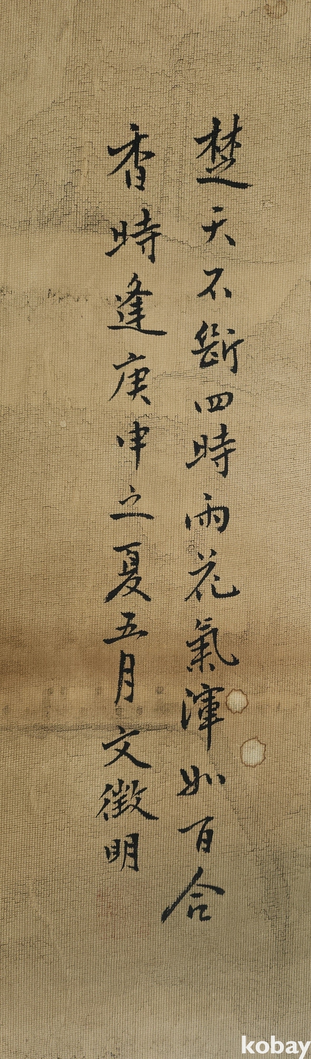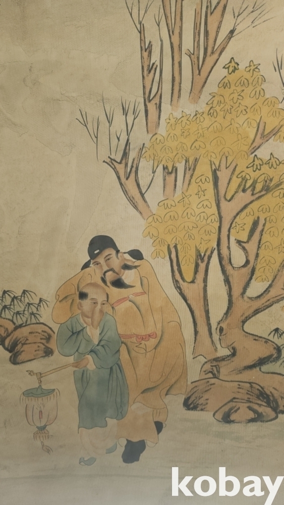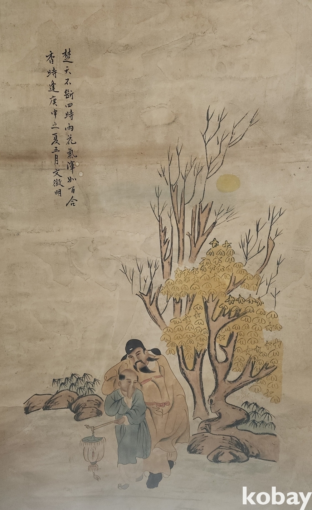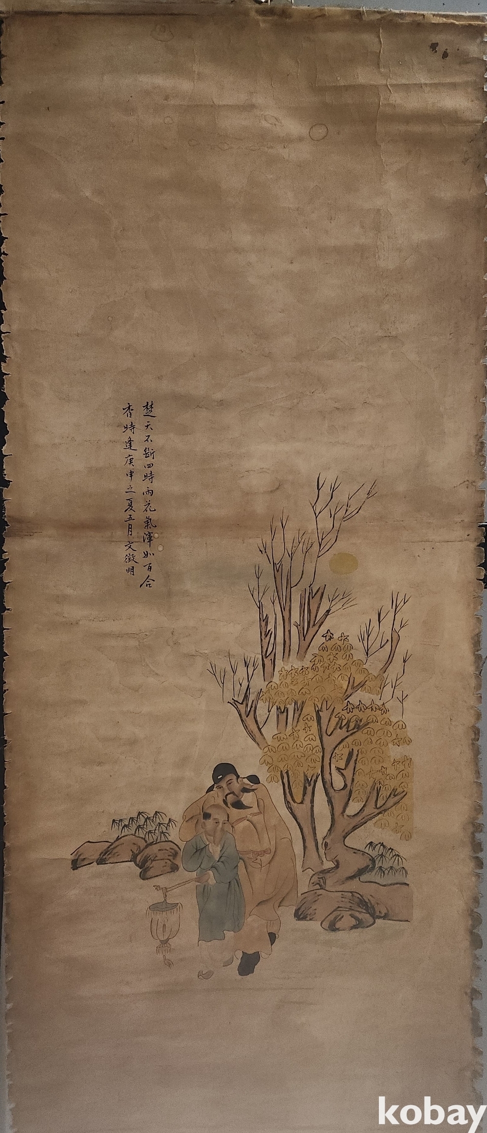 중국 명나라 가정 임금 무술년(1598년) 화가 문징명 비단에 당채로 그려진 인물화 족자입니다.