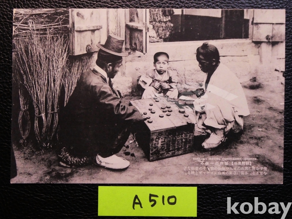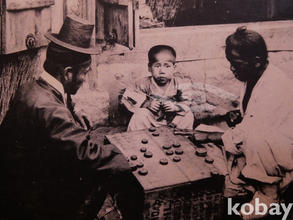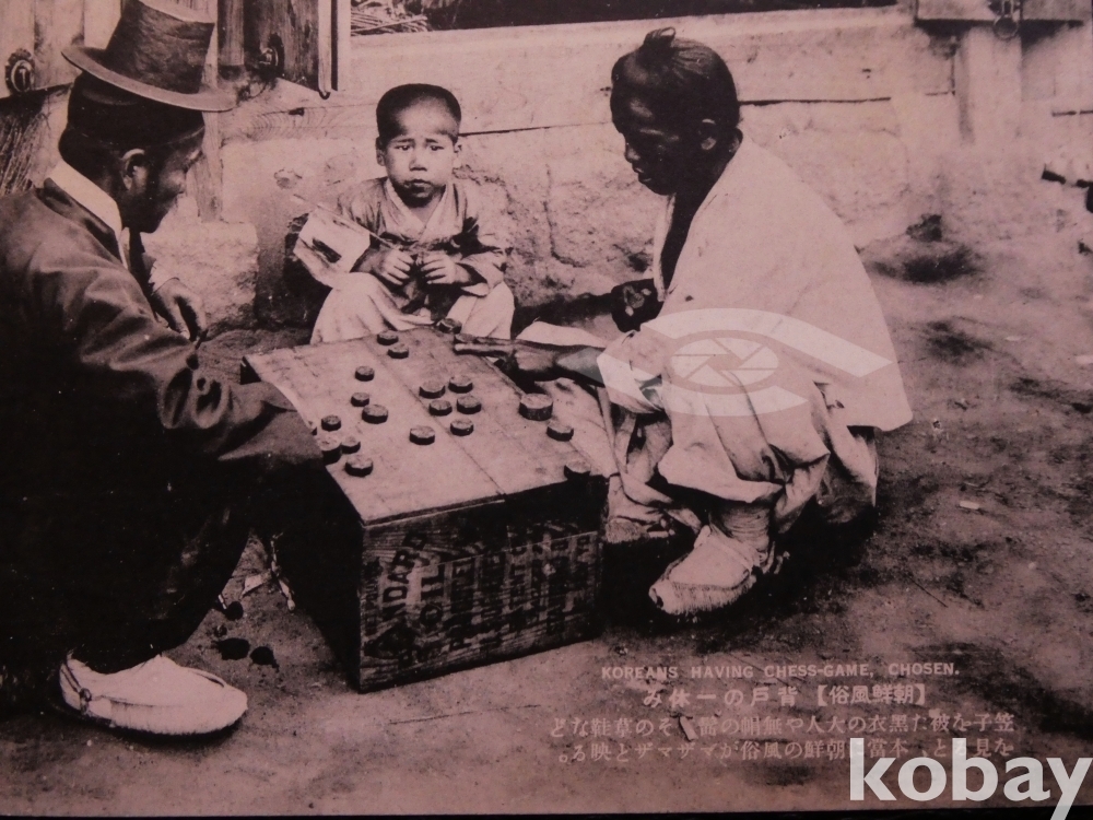 ▣근대한국엽서(진본): [조선풍속] 갓쓰고 장기 두는 모습과 구경하는 아이/1매/역사자료/일제강점기 사진엽서, 그림엽서, 회엽서. A510
