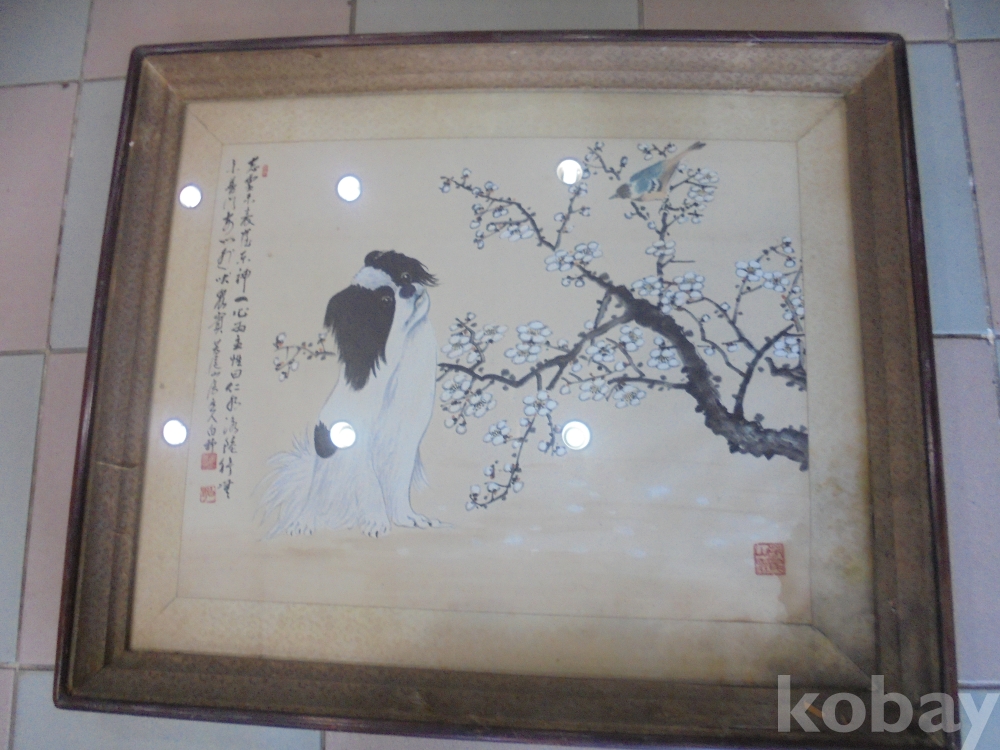 특이하게 화조가 많으나 매화꽃에 귀한새가 예쁜강아지와 대화하는 그림은 특이한것으로 액자가 상한것이나 수리하면 되는 매화 새 강아지 액자