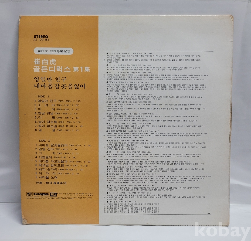 | 자켓상태 | VG : 주름, 접힘, 모서리 찢김 다수 | 음반상태 | VG : 생활 기스 다수, 가벼운 노이즈 존재 | 발매정보 | 초반 | 가사지여부 | 무 |
