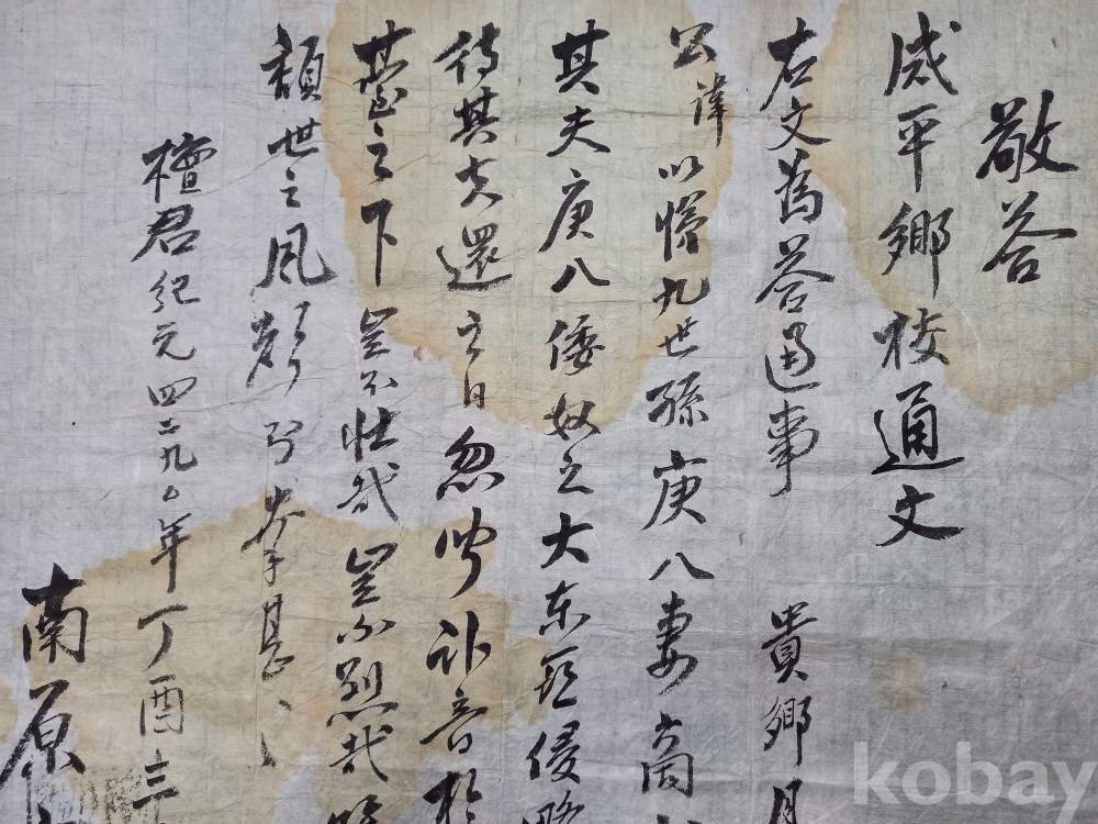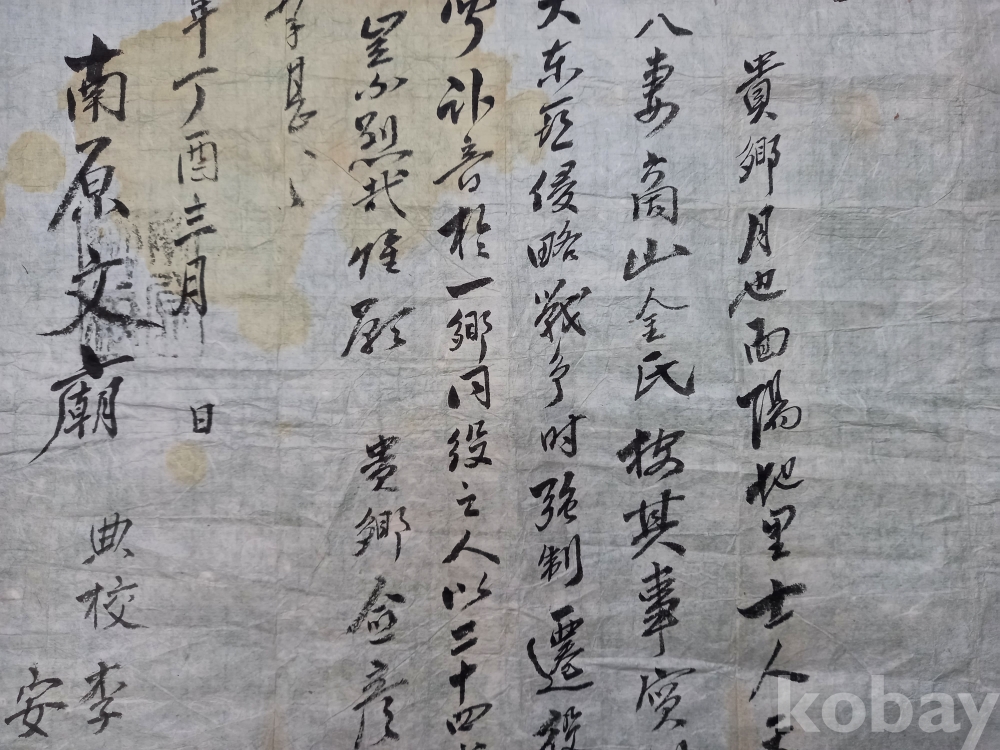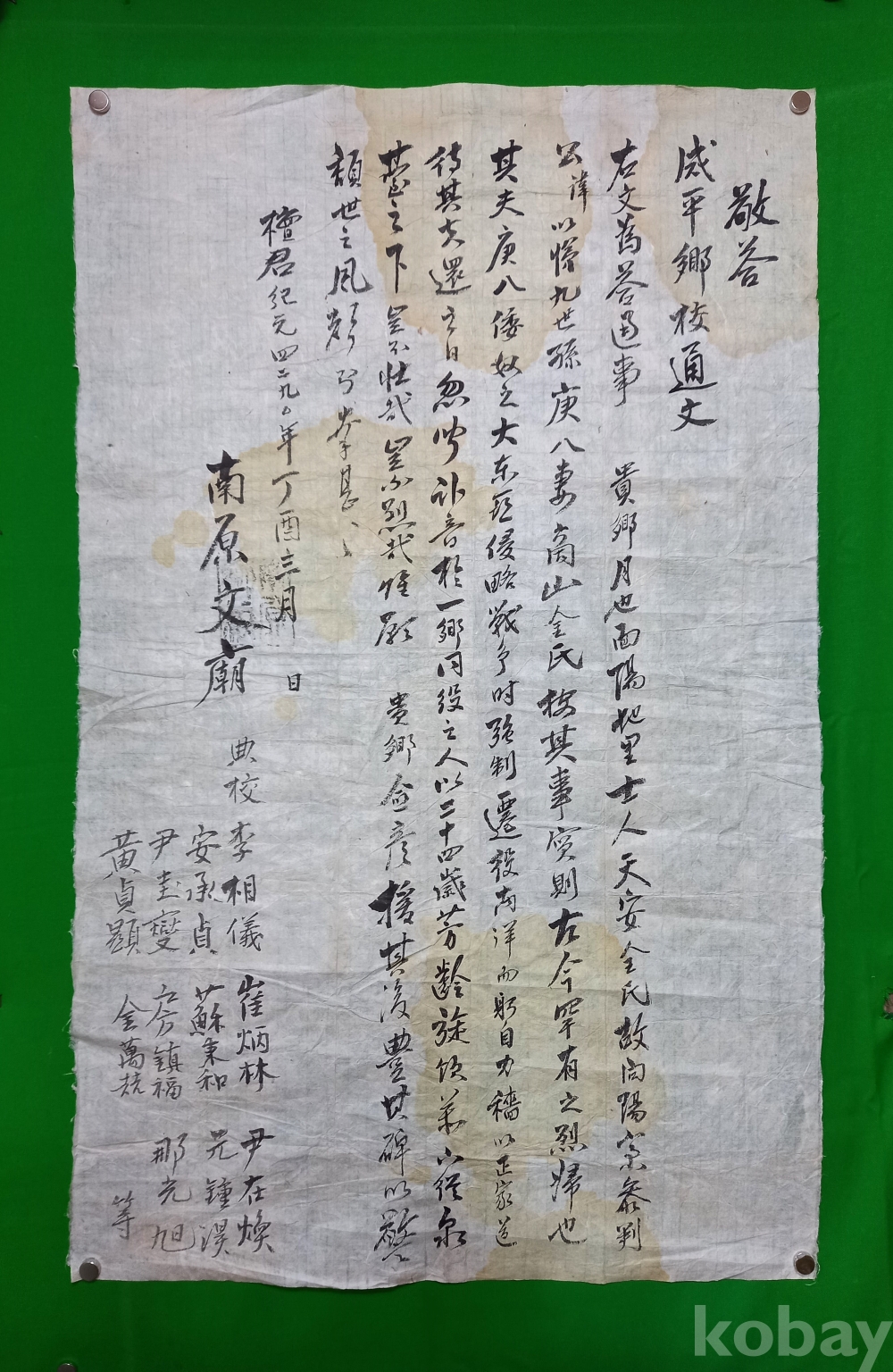 이 문서는 남원대묘(南原大廟)의 전교(典校) 이일(李日)이 작성한 성평향족통문(成平鄕族通文)으로 보이는 한자 고문서입니다.