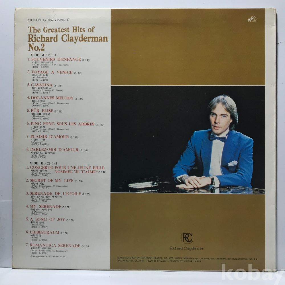 LP LP 1-21-25 Richard Clayderman - The Greatest Hits of Richard Clayderman Vol. 2 . 자켓 EX 알판 EX+ 83 년 국내반