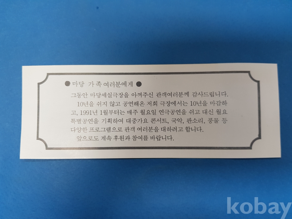 **** 우리극단 마당 제100회 공연 '돌아돌아돌고돌아' 초청권/1991년1월2일~31일/마당실세극장