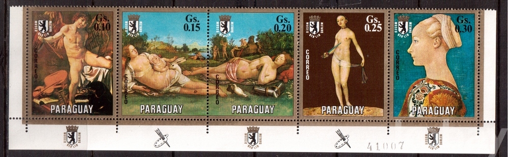 (누드명화) Paraguay (파라과이) 1969 카라바조외 누드화 strips of 5 MNH