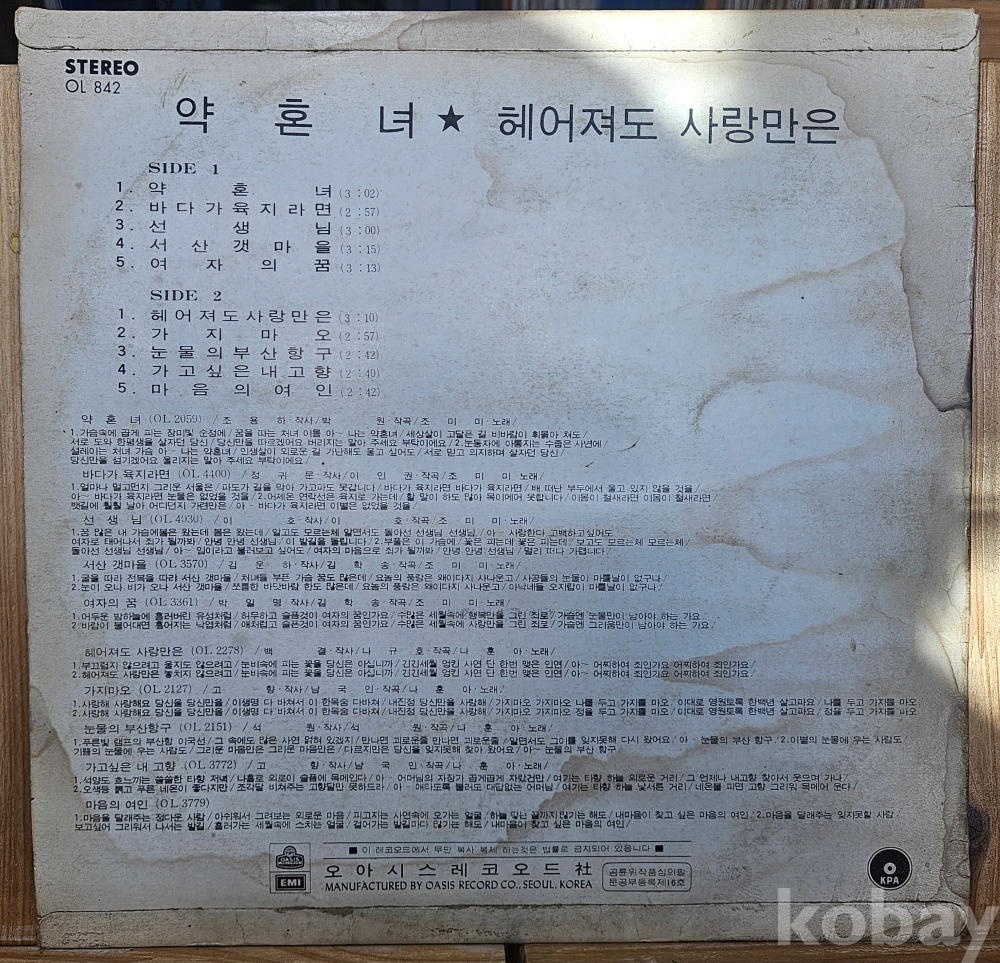 | 자켓상태 | VG : 주름, 접힘, 모서리 찢김 다수 | 음반상태 | EX : 재생에 영향 없는 가벼운 기스 존재 | 발매정보 | 초반 | 가사지여부 | 유 |