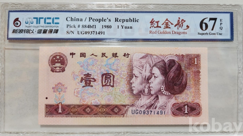 -1990년 중국 1위안 지폐 TCC67 고등급 입니다.