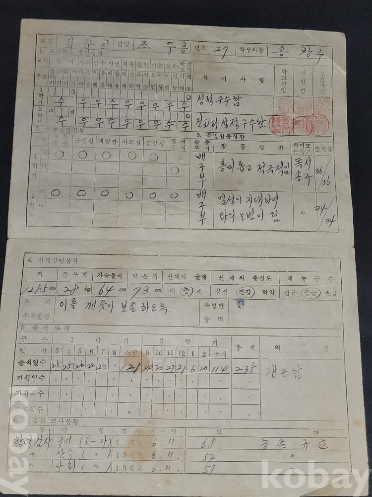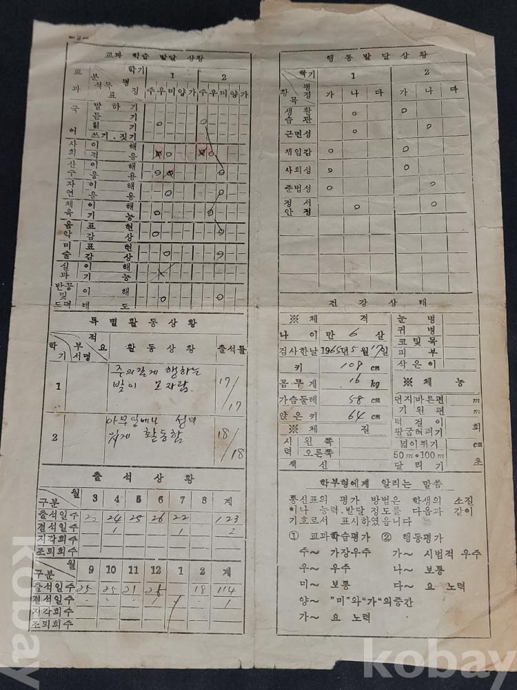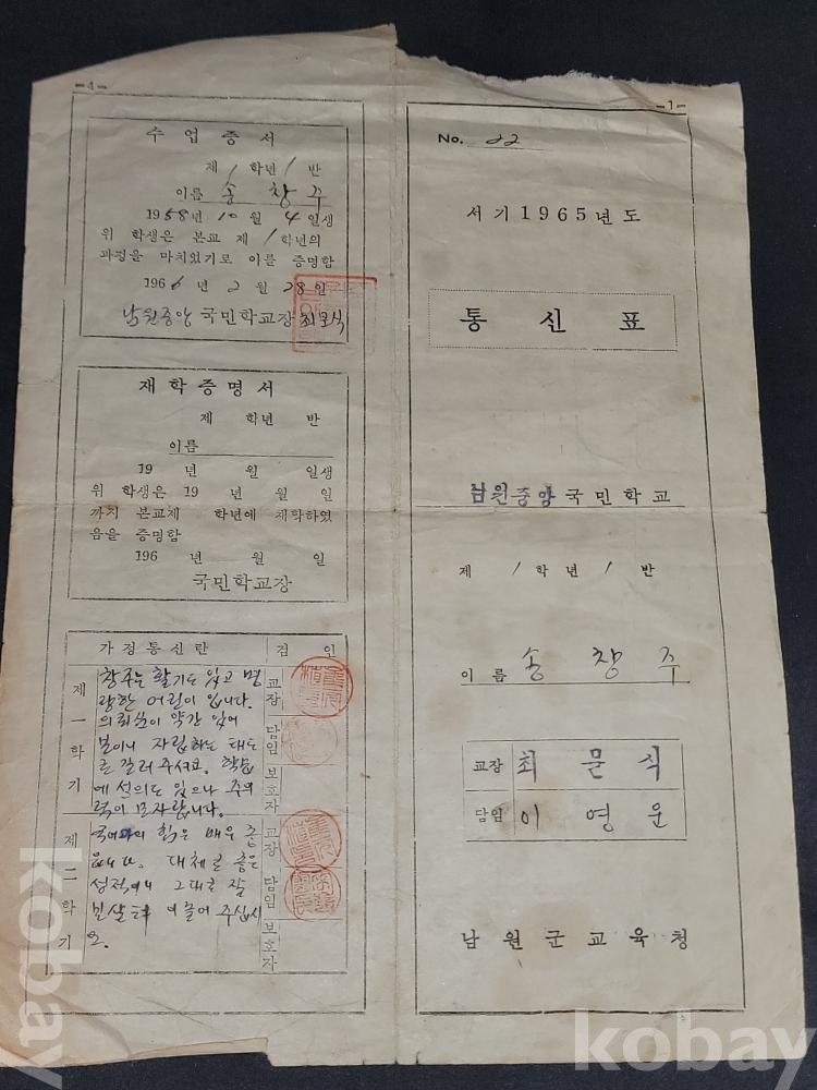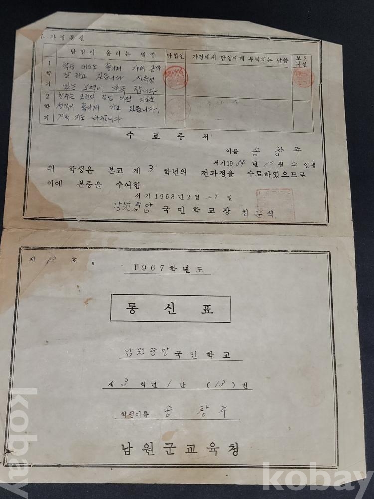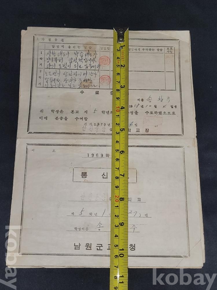빈티지 세월 감이 느껴지는 1965년, 1967년, 1968년, 1969년 남원중앙 국민학교 각종 학교 통신표 5장 일괄입니다.