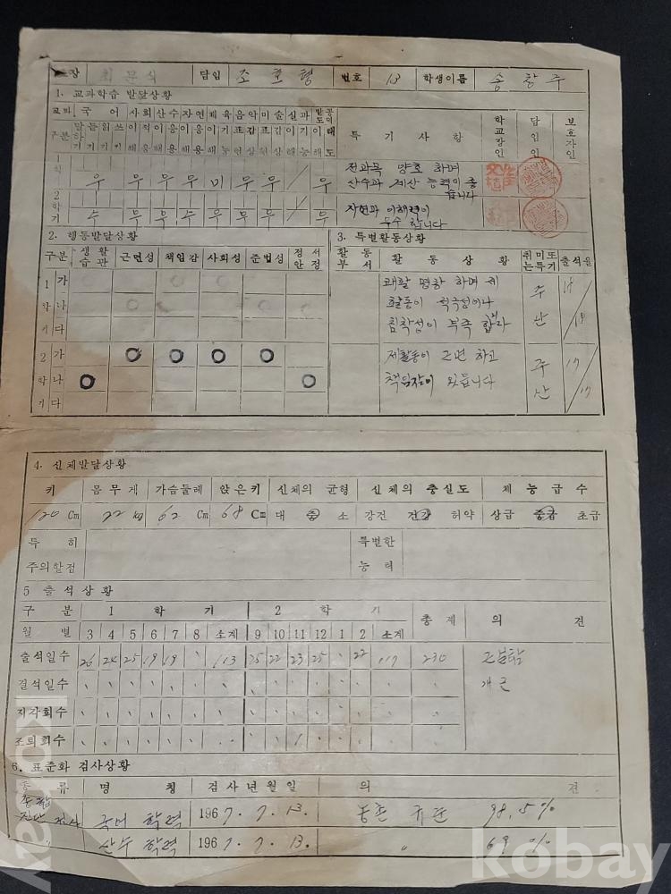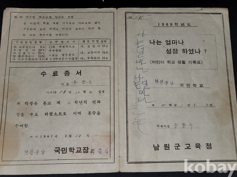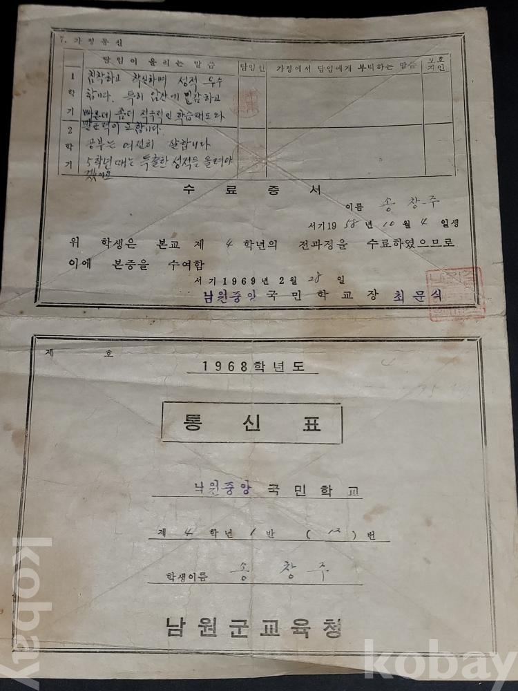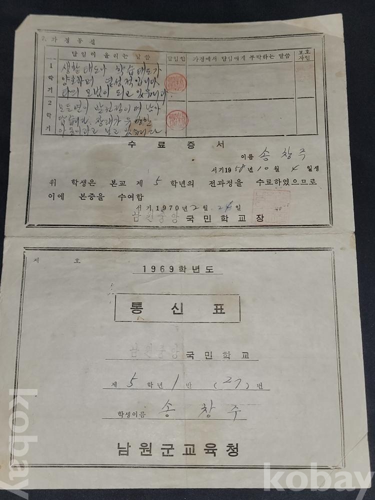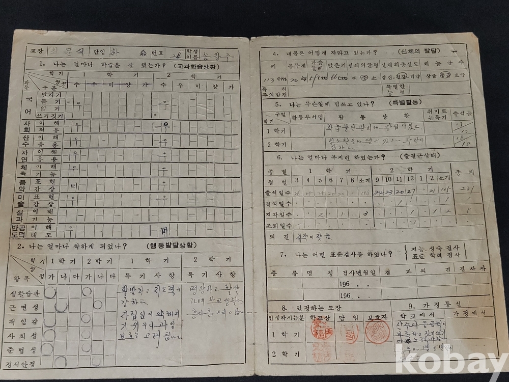 빈티지 세월 감이 느껴지는 1965년, 1967년, 1968년, 1969년 남원중앙 국민학교 각종 학교 통신표 5장 일괄입니다.