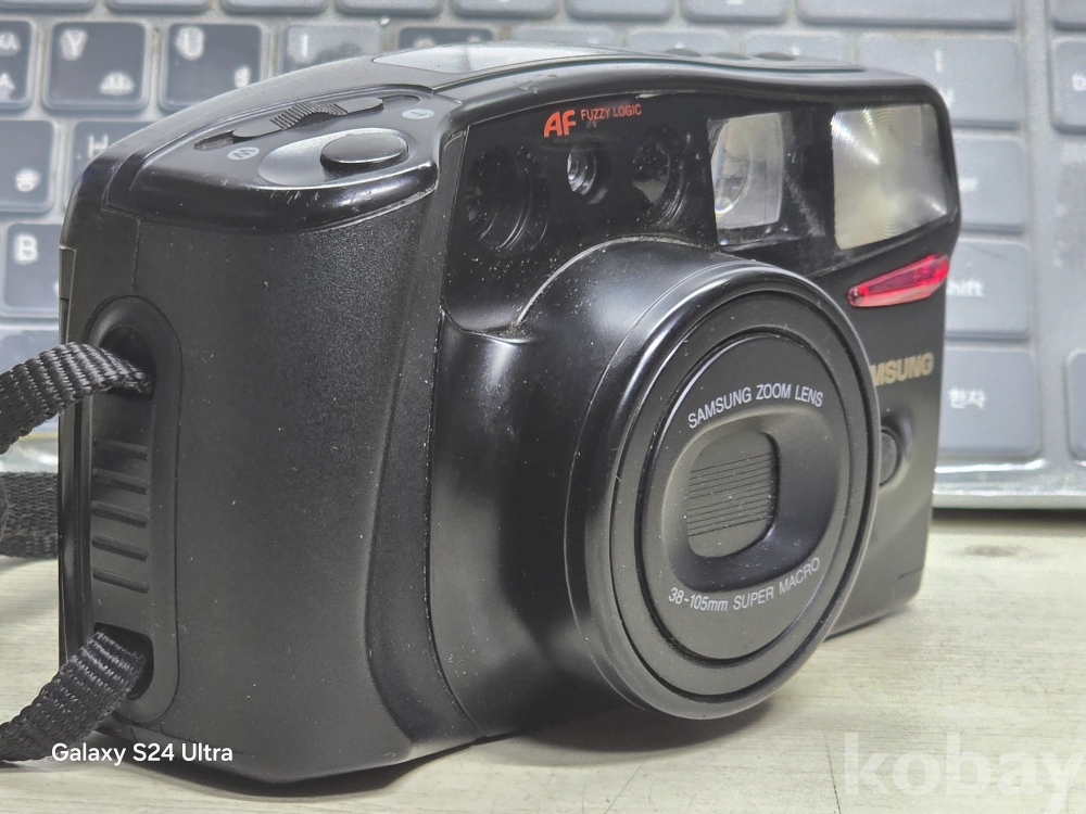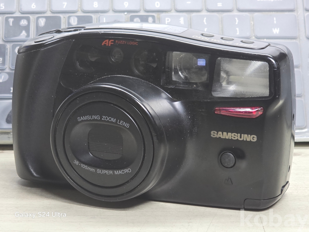 이 카메라는 **Samsung Fuzzy Zoom Slim**, 삼성의 슬림형 포인트 앤 슛 필름 카메라입니다.