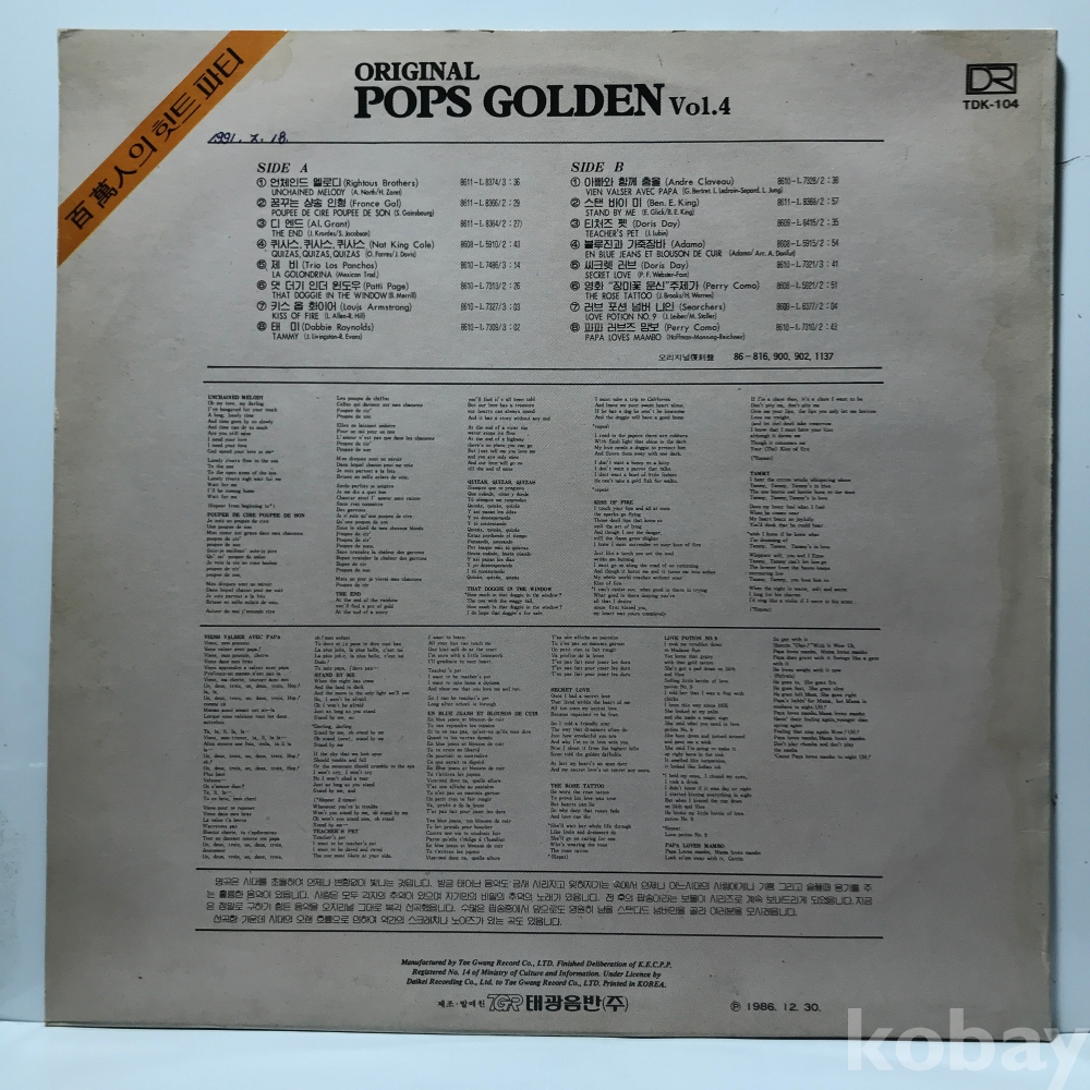 LP LP 1-23-34 Various Artists - Original Pops Golden Vol. 4 . 자켓 EX 알판 EX 86 년 국내반